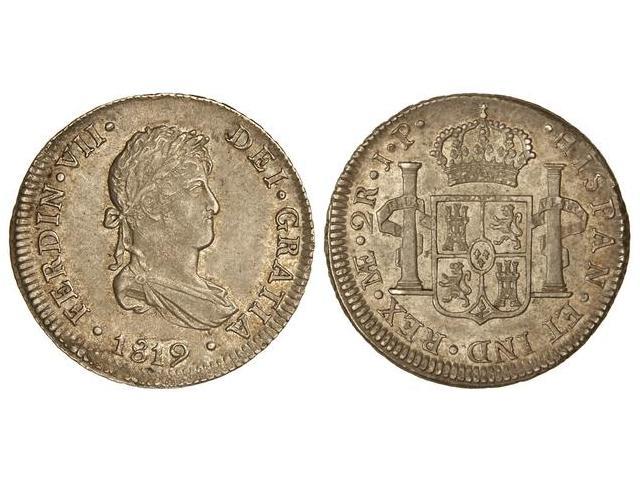 SPANISH MONARCHY: FERDINAND VII - 2 Reales. 1819. LIMA. J.P. Restos de brillo original. (Pequeño defecto en gráfila del anverso). Cal-907. SC.
