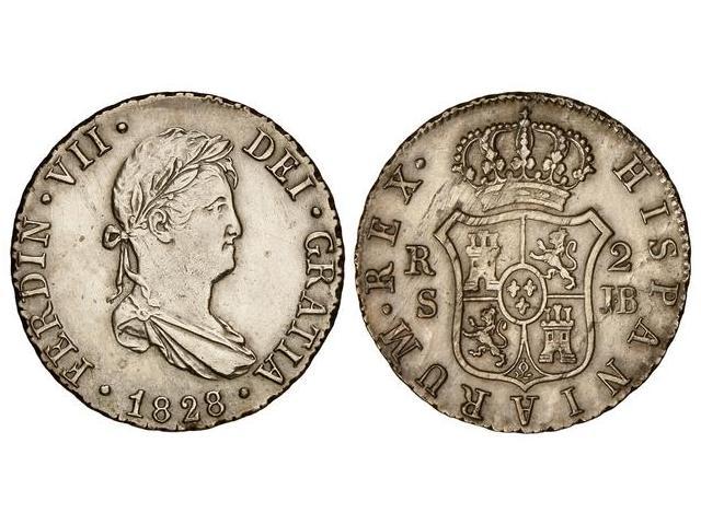 SPANISH MONARCHY: FERDINAND VII - 2 Reales. 1828/7. SEVILLA. JB. (Limpiada). Cal-1036 Var. sobrefecha. (EBC-).