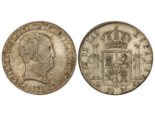 SPANISH MONARCHY: FERDINAND VII - 20 Reales. 1822. SEVILLA. R.D. Pátina. Acuñación algo floja en anverso. Cal-645. MBC+/EBC.