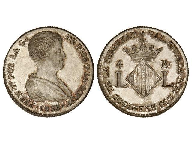 SPANISH MONARCHY: FERDINAND VII - 4 Reales. 1823. VALENCIA. Módulo 2 Reales. Brillo original. Bonita pátina. MAGNÍFICA. MUY RARA ASÍ. Cal-1061. SC.