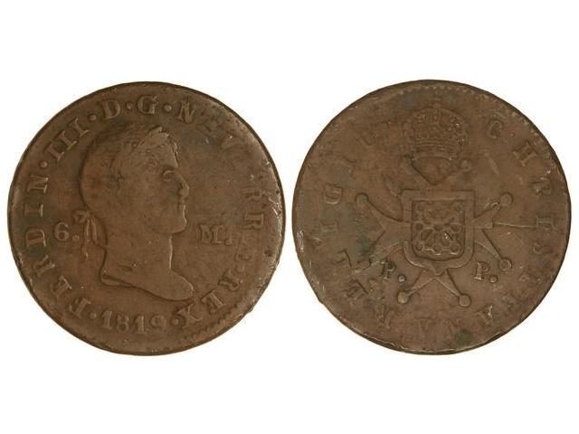 SPANISH MONARCHY: FERDINAND VII - 6 Maravedís. 1819. PAMPLONA. Anv.: FERDIN. (Algo alabeada). MUY ESCASA. Cal-1636. MBC-.