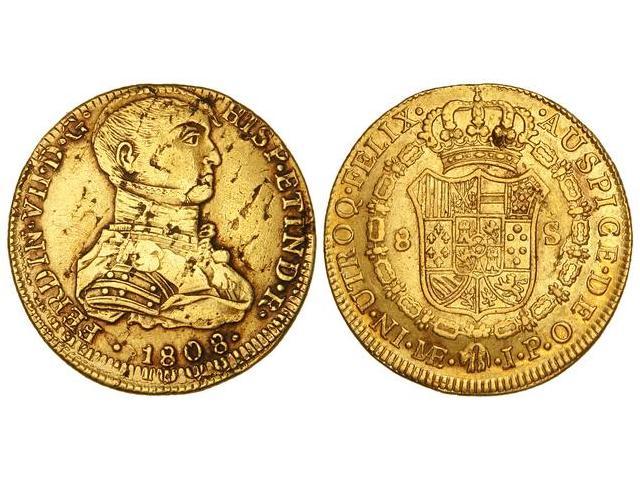 SPANISH MONARCHY: FERDINAND VII - 8 Escudos. 1808. LIMA. J.P. Primera fecha de busto limeño. (Repintada. Hojas en anverso). RARA. Cal-12; XC-1210. (MBC).