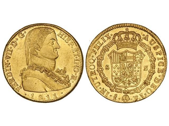 SPANISH MONARCHY: FERDINAND VII - 8 Escudos. 1811. SANTIAGO. F.J. Busto Almirante. Restos de brillo original. (Leves hojitas y golpecitos). MUY ESCASA. Cal-116; XC-1348. EBC-.