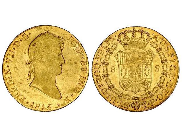 SPANISH MONARCHY: FERDINAND VII - 8 Escudos. 1815. LIMA. J.P. Restos de brillo original. (Hojitas en anverso y cuño oxidado en reverso). Cal-21; XC-1222. EBC/EBC+.