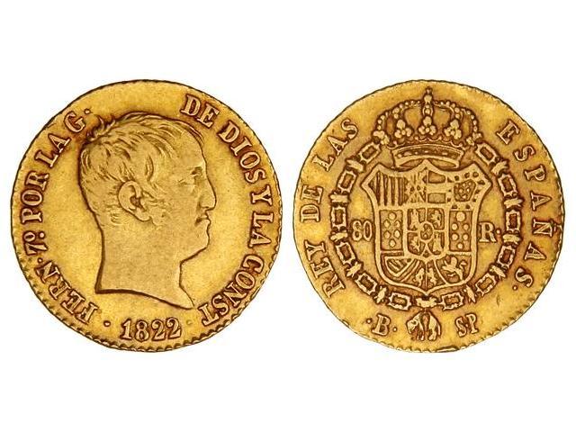 SPANISH MONARCHY: FERDINAND VII - 80 Reales. 1822. BARCELONA. S.P. MUY ESCASA. Cal-173. MBC.