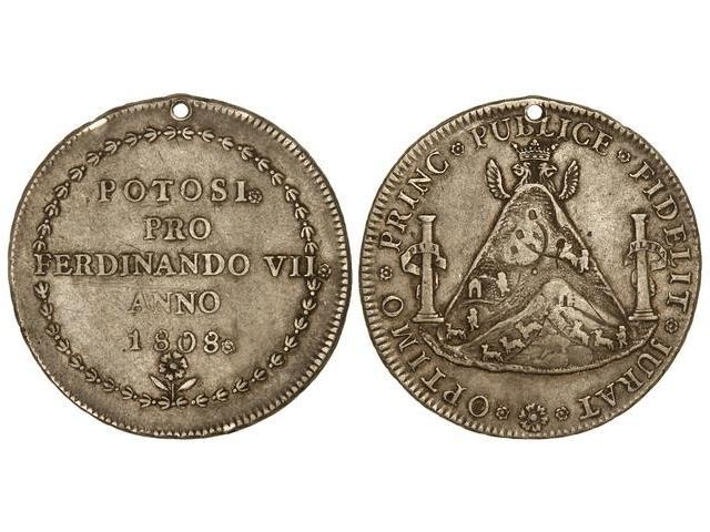 SPANISH MONARCHY: FERDINAND VII - Medalla Proclamación. Módulo 8 Reales. 1808. POTOSÍ. AR. Ø 39 mm. Perforación. (Pequeñas rayitas). He-50. MBC+.