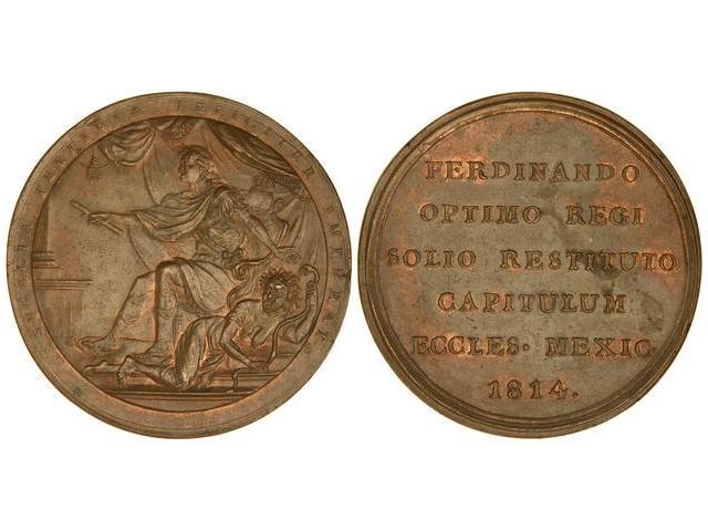 SPANISH MONARCHY: FERDINAND VII - Medalla Restitución Fernando VII. 1814. MÉXICO. Rev.: Fernando VII vestido a la romana con láurea y cetro, sentado en un trono. AE. Ø 51 mm. Grabador: José Guerrero. (Pequeños golpecitos). V.Q.-14206. EBC-.
