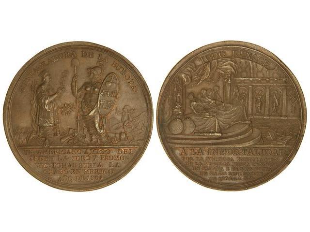 SPANISH MONARCHY: FERDINAND VII - Medalla de la Suprema Junta de España e Indias. 1808. Anv.: Alegorías de España y América. Rev.: Mesa en un estrado entre dos columnas, con los tres miembros de la Junta Suprema de España e Indias. Br. Ø 52,3 mm. Grabador: Tomás Suría. (Golp