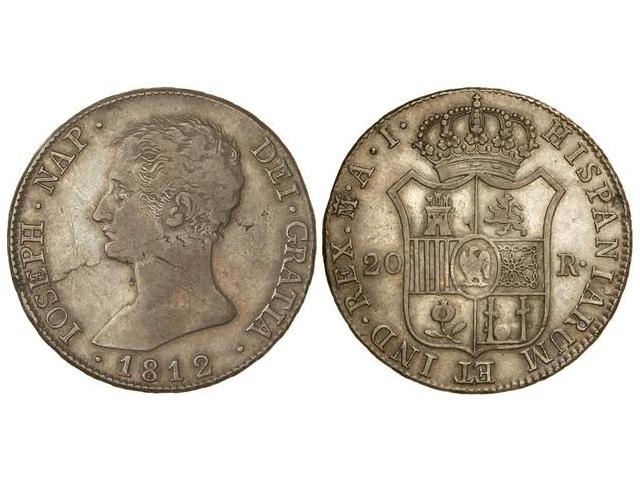 SPANISH MONARCHY: JOSEPH NAPOLEON - 20 Reales. 1812. MADRID. A.I. Pátina oscura. (Hojas y rayas en anverso). Cal-30. MBC/MBC+.
