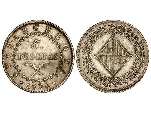 SPANISH MONARCHY: NAPOLEONIC OCCUPATION OF CATALONIA - 5 Pesetas. 1808. BARCELONA. (Pequeñas rayitas de ajuste en reverso). Cal-13. EBC-.