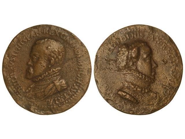 SPANISH MONARCHY: PHILIP II - Medalla boda Felipe II y Ana de Austria. (1571). Anv.: Busto del rey a izquierda. Rev.: Busto de la reina a derecha. Br fundida. Ø 39 mm. RAH-56 mismo cuño. MBC+.