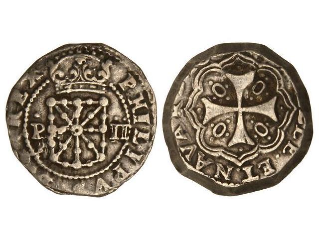 SPANISH MONARCHY: PHILIP III - 2 Reales. 16(__). PAMPLONA. Fecha no visible. Valor en posición vertical. RARA. Cal-Tipo 111a. MBC+.
