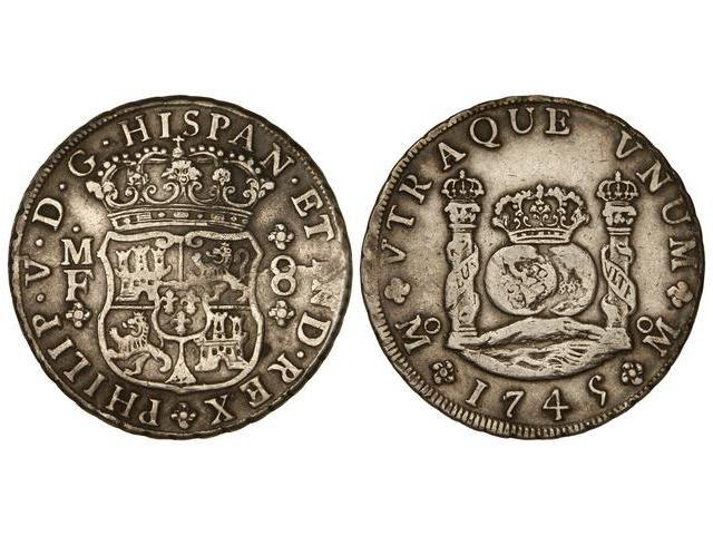 SPANISH MONARCHY: PHILIP V - 8 Reales. 1745. MÉXICO. M.F. Columnario. (Rotura de cuño en anverso). Cal-798. MBC.