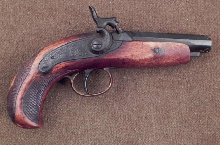 SPANISH PERCUSSION PISTOL-MARKED C/2MM 207 * CHECKERED WOOD GRIP-SOME OLD TAPE TOWARD END OF BARREL-SCROLL WORK ON SIDE PLATE & HAMMER *