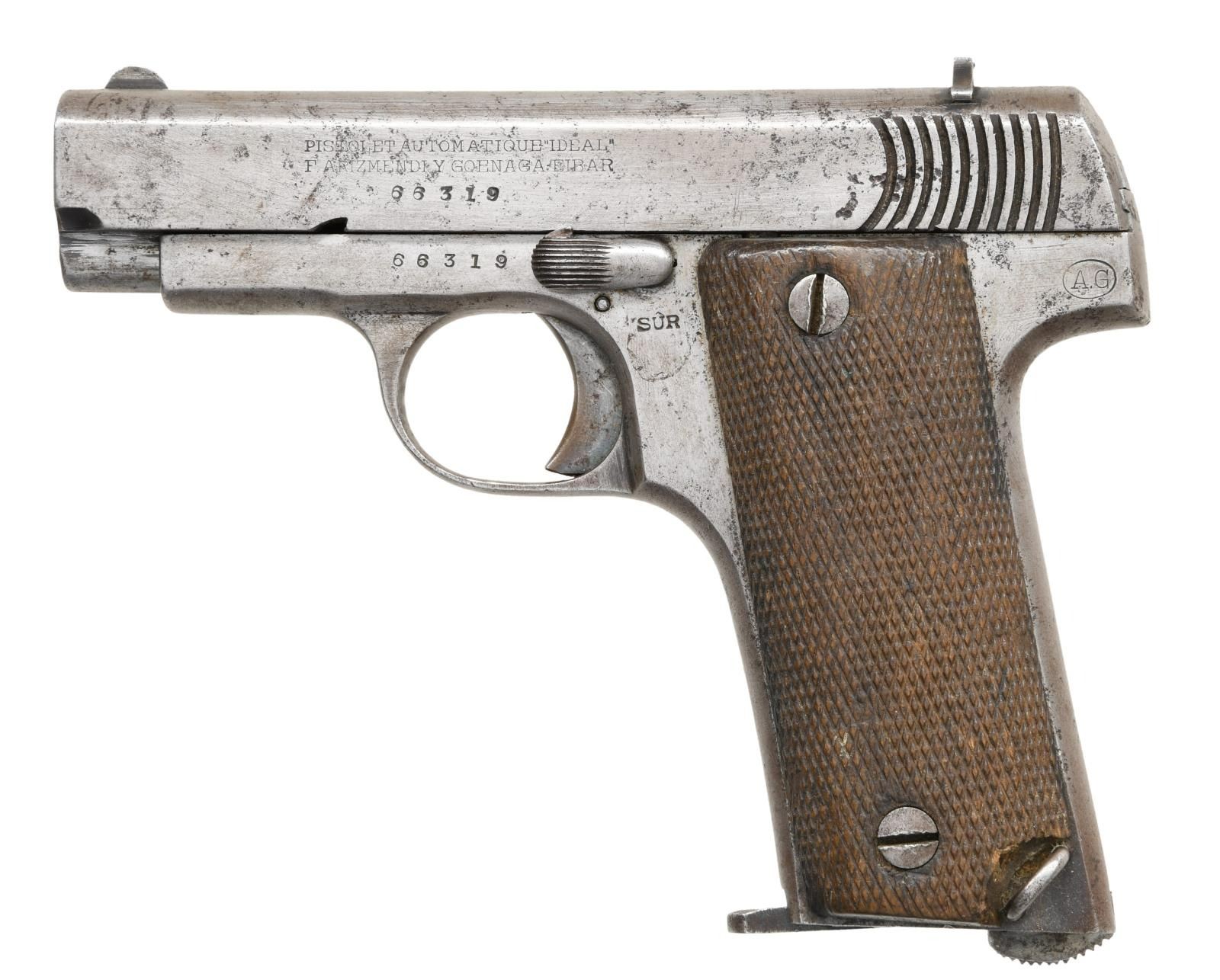 Cal. 7.65mm (32 ACP). S# 66319. Bbl. 3 1/4". Matching numbers on slide & frame. Left side of frame has "IDEAL" & Arizmendiy markings. Safety has French "SUR" & "FEU" markings but no stars present on mag. well. Fixed V-notch rear sight. Rounded blade front sight. Slide stop not holding & will require attention. Checkered wood grips. MAGS: 1-9 rd. marked "GU" on floorplate. CONDITION: grips show heavy handling wear, flattened points & dirt staining. Metal is a cleaned silvery gray w/ scattered pitting & oxidation. Good bore that will likely clean up better. (23-1850/MJC). CURIO. $200-300.