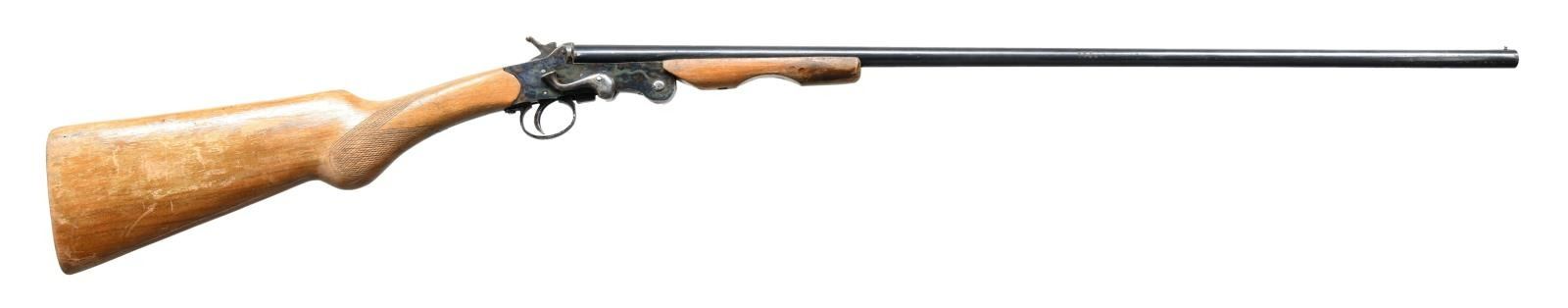 Cal. .410 GA. S# 18631NF. Bbl 27-3/4". Case color hardened frame and side lever. Blued barrel, with anodized aluminum trigger guard. Aluminum bead from sight. Wood buttstock with checking at wrist and large diamonds carved at the butt. Wood forend. Spanish proofs on top of barrel and receiver. CONDITION: Frame retains strong case coloring with moderate edge wear and some scattered surface oxidation. Bbl retains the majority of its factory blue finish, with scattered spots of surface oxidation. Dark bore. Furniture exhibits some losses to the varnish and scattered marks from handling and storage. (23-2062/MLW). MODERN. $300-500