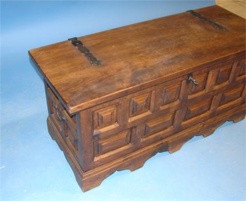 SPANSISH STYLE PANELED BLANKET CHEST. Cut-out apron and wrought-iron hardware, 19”H, 39.25”L, 15.5”D