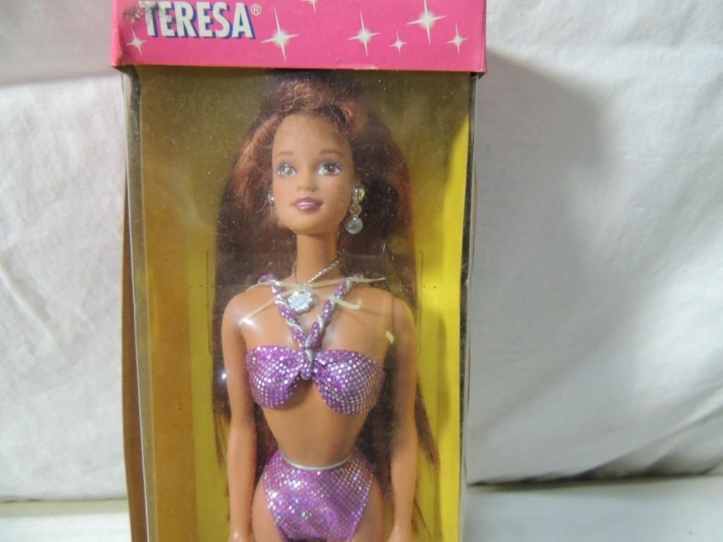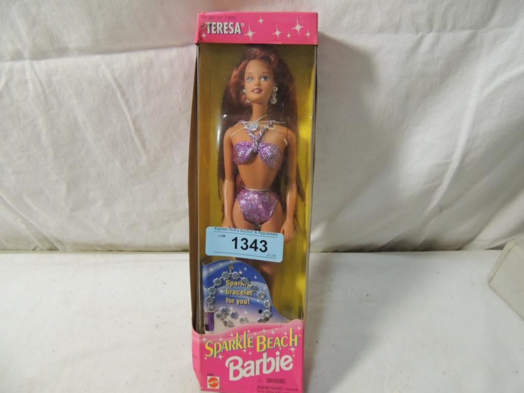 SPARKLE BEACH TERESA DOLL IN BOX. SPARKLY BRACELET INCLUDED IN ORGINAL BOX. GOOD CONDITION. HIGHLY COLLECTIBLE. BARBIE DOLL. AS SHOWN SEE PHOTO FOR MORE DETAILS.