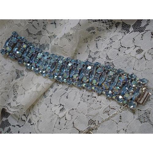 SPARKLING VINTAGE BRACELET, MADE FROM BEAUTIFUL IRIDESCENT BLUE COLOR RHINESTONES, as per images,It has quite an unusual combination of stones in appearance and shape and all of them prong set,This bracelet also have safety chain, Excellent condition ? The clasp is functioning well, all stones are present and there are no chips or cracks,Please study the images as they are part of description.Measures about 7 1/4 inch long and over 1 inch wide.US Buyer please remit 7.00 for shipping plus insurance.THANKS.