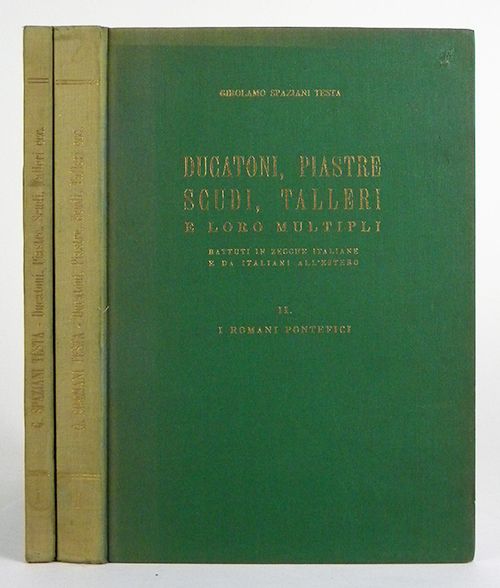 Spaziani Testa, Girolamo. DUCATONI, PIASTRE, SCUDI, TALLERI E LORO MULTIPLI BATTUTI IN ZECCHE ITALIANE E DA ITALIANI ALL'ESTERO. I.: CASA SAVOIA (1497-1946). II.: I ROMANI PONTEFICI (1523-1870). Rome, 1951-52. Two volumes. 8vo, original green cloth, gilt. 75, (1); 159, (1) pages; text illustrations; valuation lists. Spines sunned. Near fine. Clain-Stefanelli 10403 & 10376.