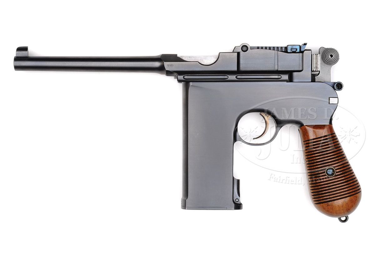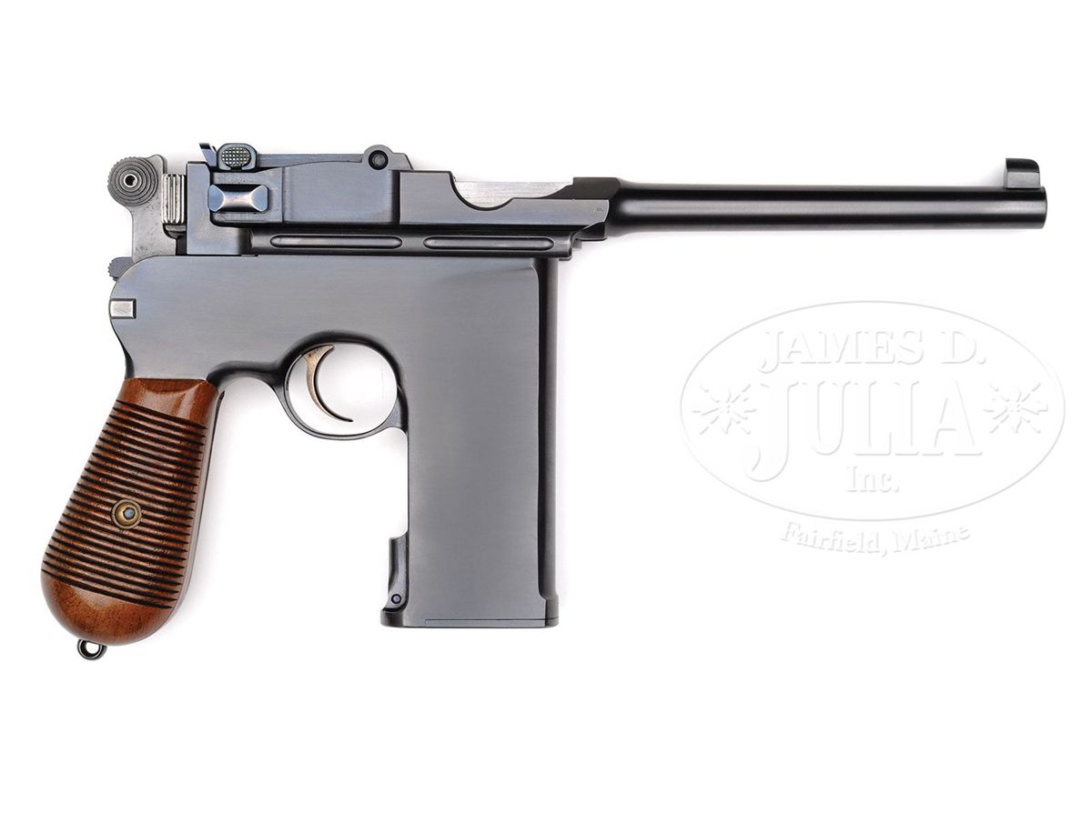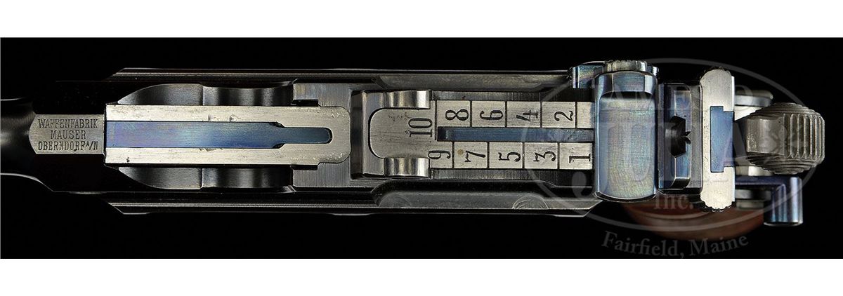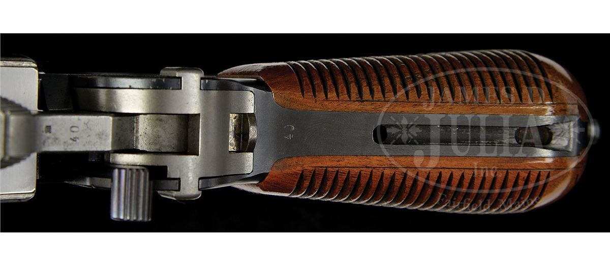 SN 40. Caliber 7.63mm. Mauser made about 100 twenty shot Flatside Conehammers in a separate serial range numbered 1-100. There is a variance in details. Some pistols have a pinned rear sight and a separately retained firing pin while others have a slip-in rear sight and a single lug firing pin. This gun, as a mid-production example, has a combination of features that should fascinate every collector. It has a 5.5" bbl and a slip-in 1-10 rear sight. Standard chamber address with Crown U marking on the left side of the bbl extension and an antler proof on the right side. There are no external markings on the frame except for the serial number on the backstrap, just below the locking lever. The bolt is early with a long extractor and a separately retained firing pin while the frame has been fitted with the later trigger as used for the standard Flatside pistols. The extractor, cursor, bolt stop, and firing retainer are fire blued while the trigger is strawed. Standard serrated walnut grips. No lanyard ring. Detailed disassembly shows all matching parts with an unnumbered sear and a cleaned transfer bar. No evidence that any numbers have been welded over for creative matching. Just enough defects and age on the subframe and inside the floorplate to convince any skeptic that this is a "real" 20-shot as opposed to the creations that have been recently offered for sale. PROVENANCE: Joseph J. Schroeder, Jr. Collection. CONDITION: The gun has been professionally restored with perfect attention to all details. All surface planes are flat and appear factory new. The chamber address is crisp and both the Crown U and antler markings have been restruck. Absolutely perfect replacement grips correctly marked with a matching serial number. Very good bore with easily discernible rifling amidst oxidation from corrosive ammunition. Perfect mechanics. 4-48542 LMA30