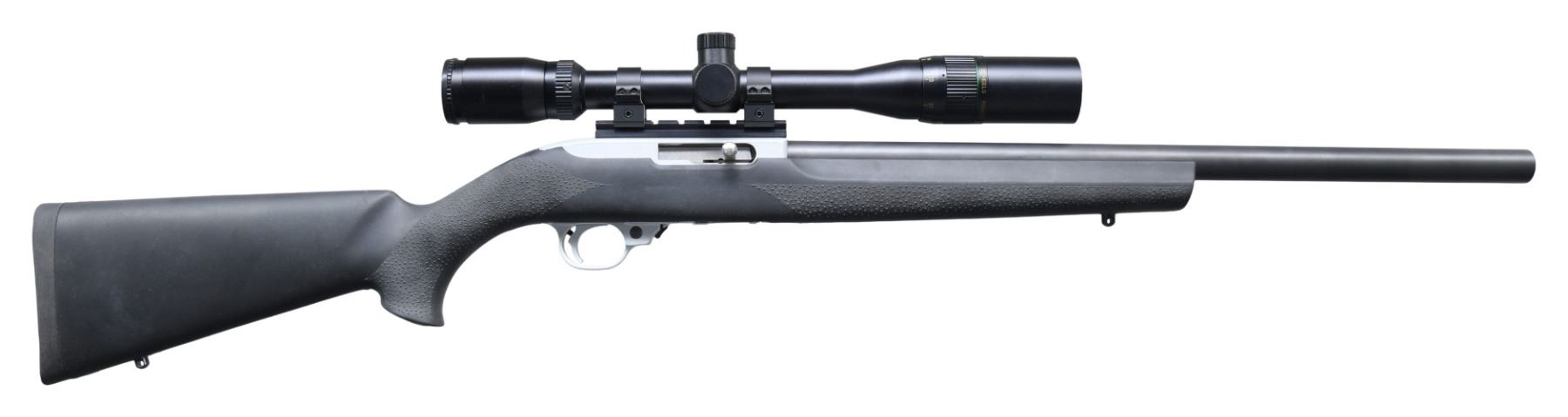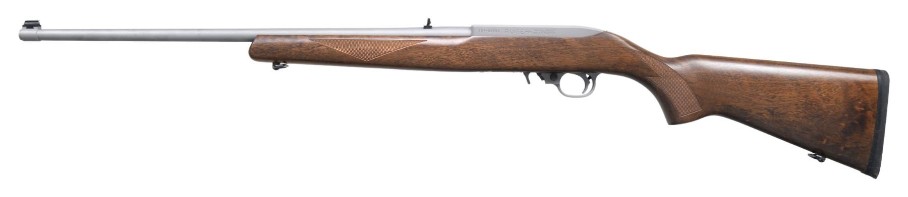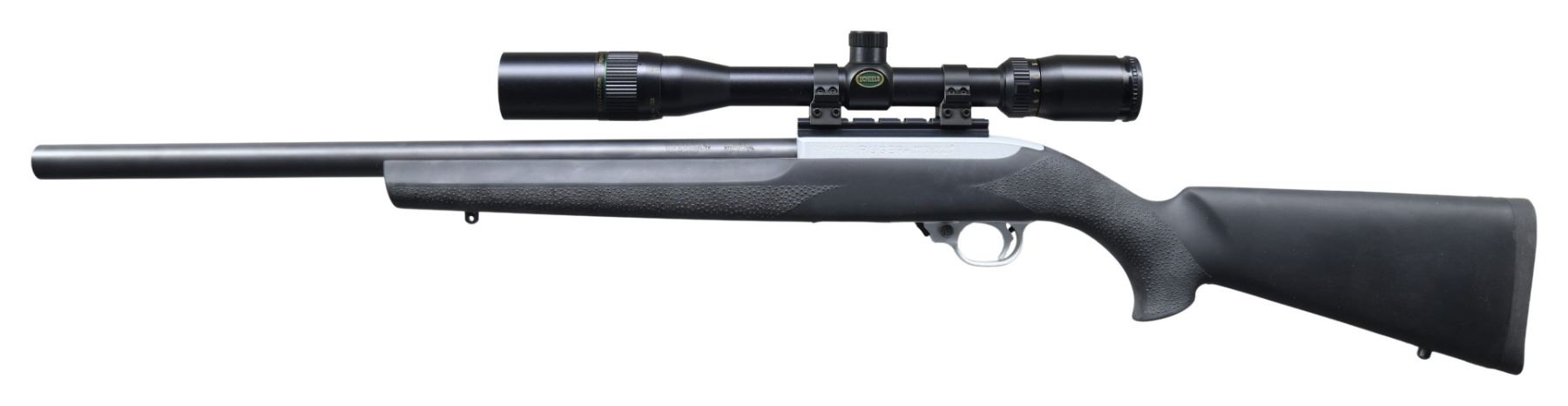 1) SPECIAL RUGER STAINLESS MODEL 10/22 SPORTER SEMI- AUTO RIFLE. Cal. 22 LR. S# 355-00000. Bbl. 22" with banded front base holding blued brass bead sight plus matching folding leaf at rear. Mfg. 2009 as Model 01149; Lipsey's Distributors excusive with matte stainless finish and extended magazine release. Walnut stained checkered Beech stock with factory sling swivels and black rubber pad. MAGS: 1 factory 10 round. CONDITION: all aspects near excellent with new, unfired appearance. (24-3212/NW). 2) CUSTOM RUGER MODEL 10/22 SEMI-AUTO CARBINE. Cal. .17AG / .17PMC. S# 259-43527. Bbl. 20" matte blued .920" bull by Clerke International Arms; no provision for sights. Rifle manufactured 2006 as stainless Model 01140 Carbine in 22 LR. Basic original receiver and triggerguard fitted with aftermarket bolt assembly having grooved round cocking piece. Hogue Overmolded black rubber stock with pebble grained gripping panels, black rubber pad and sling studs. One piece matte black Picatinny style base with matching alloy scope rings holding Scheels matte finished 4-12X32 scope having sun shade and adjustable objective plus Euro fast focus eyepiece. Caliber originated in 2004 by High Standard as joint venture with Aguila; also made by PMC. Demise of the cartridge came when Hornady introduced 17 HMR and 17 Mach 2. This caliber can be used in the Hornady Mach 2 but the Mach 2 cannot be used in this offering. Design of rifle allows easy user barrel change to 22 LR. MAGS: 1 clear factory 10 rd. CONDITION: stiff operation of scope power ring; resistive about 7 power. All other aspects near excellent including bore. (24-3215/NW). ALL MODERN. $500-800.