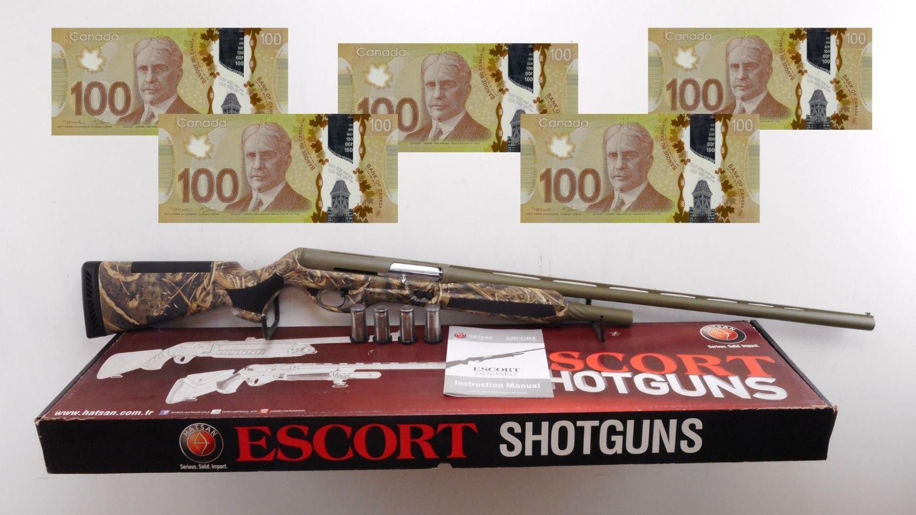 SPECIAL DRAW, ONLY 100 TICKETS AVAILABLE, STARTING AT $25.00 , Raffle prize is your choice of $500.00 cash or A Hatsan Escort Dynamax RT Max 5 Semi Automatic Shotgun, chambered in 12ga x 3". We are offering a limit of 100 tickets with the bidding starting at $25. You can bid as much as you want on each ticket. The highest bid will be the winner of the ticket that will be entered into the draw. There will be no sales tax on this session. Raffle prize is either $500 cash or A Hatsan Escort Dynamax RT Max 5 Semi Automatic Shotgun, chambered in 12ga x 3". The stock is synthetic camo, barrel is green "cerakote" finish. It comes brand new in the box, with 5 interchangeable chokes. This prize has been Donated by Switzer's Auction & Appraisal Service. The Manufactured suggested list prices is $911.45. Winner must have a valid P.A.L. to take possession. Thanks for your participation and Good Luck! Please note that this is an either or option, Cash or Firearm. At the conclusion of the auction you will get an email saying you "won" the items. What you "won" was the ticket. All tickets will be entered into the draw that will take place Saturday July 24th, at the close of the auction. The winner will be announced in an email that will be sent to all bidders at the conclusion of the auction.