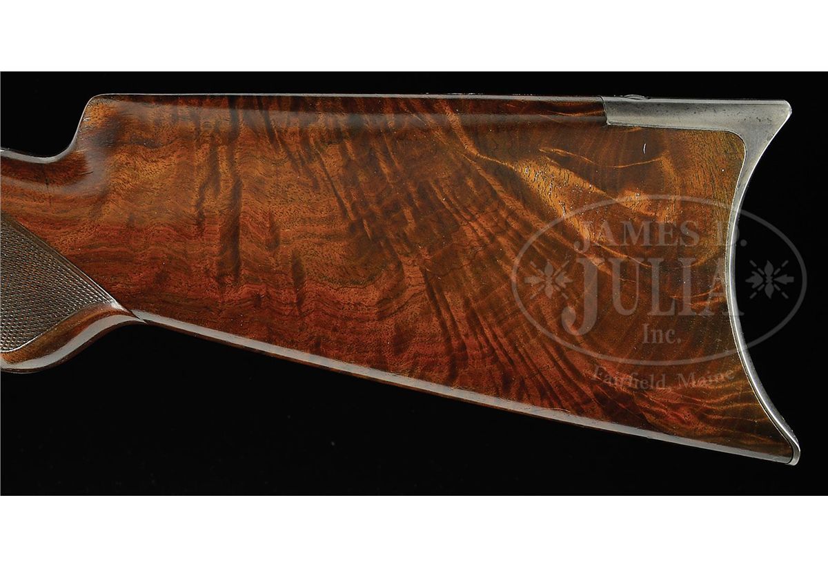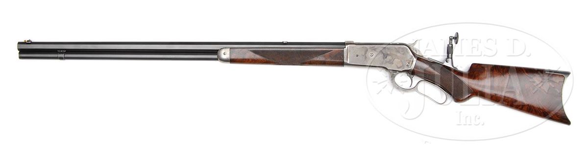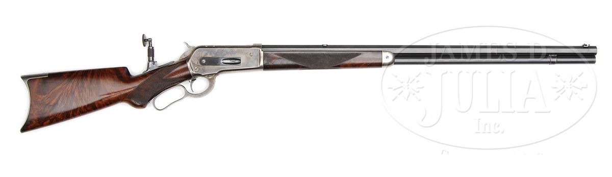 SN 48361. Cal. 38-56 re-bored to .45-70. Fine deluxe '86 with special order 28" oct bbl, full magazine, gold washed Beech's combination front sight, a slot blank in the rear seat and Lyman tang sight with windage in the base and folding aperture. Left side of receiver has two extra plugged holes. Lower tang is mounted with a sgl set trigger. Left side of lower tang, under the wood, is marked with assembly number "197" and "XX". Matching assembly number is also found in top tang channel of buttstock and inside toe of buttplate. Mounted with very highly figured, center crotch, about 3X, flame grain American walnut with H-style checkered forearm and black insert serpentine grip buttstock with crescent buttplate. This rifle would make an outstanding and classic hunting gun. CONDITION: Fine to very fine, all matching. Bbl & magazine tube retain about 98% crisp professionally restored Turnbull-style blue with only faint sharp edge wear and a minor nick or two; front sight retains about all of its orig gold wash on the loop; receiver retains faded case colors on sides and over the top, faded to silver on bottom; lever & hammer also retain faded case colors, turned silver on outer faces of lever; buttplate retains smoky case colors. Wood is sound with a few light handling & storage nicks and overall retains about all of a professionally restored finish. Mechanics are fine, bright shiny bore. 4-47350 JR140