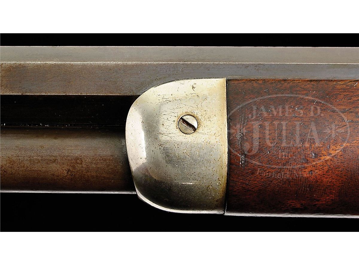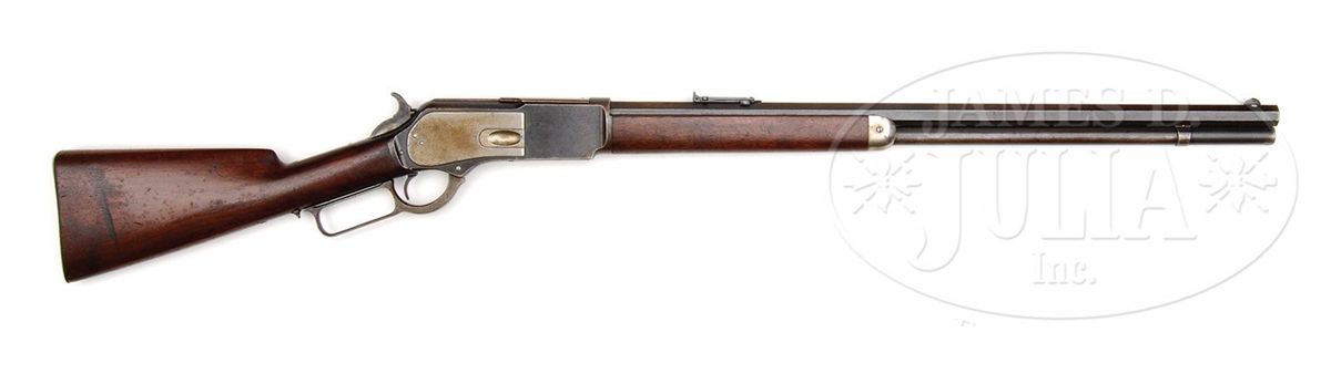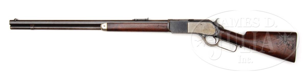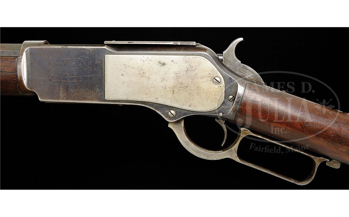SN 51766. Cal 40-60. Shorter than standard 26" oct bbl fitted with Winchester sporting leaf rear sight with 200-1000 yard graduations and Lyman ivory bead no. 4 hunting front sight. Bbl, full magazine and receiver have blued finish with nickel trimmed side plates and magazine cap. Forearm and straight grip stock of standard walnut fitted with steel shotgun buttplate.Accompanied by a Winchester factory letter listing this rifle as .40-60 with 26" oct bbl, plain trigger and shotgun butt, shipped 3-16-1886. CONDITION: Bbl and action have 50% orig blue blending with spots of patina and small areas of finish wear. Forearm cap has nickel finish with spots of patina. Side plate finish has faded to a mottled patina with some nickel finish remaining on loading gate. Lever has small amount of visible case coloring. Sounds stocks have areas of finish wear with handling marks, the heaviest being on right side of the stock. Bore has darkened appearance with areas of very light pitting. Action has smooth mechanics. 4-46162 DS6
