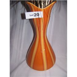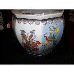 HAND PAINTED ASIAN PLANTER 12T X 13W WITH SCENES OF BIRDS ON OUTSIDE & KOI IN INTERIOR,