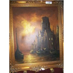 VINTAGE OIL ON CANVAS SIGNED PAINTING, SPANISH SHIPS BY CASTLE