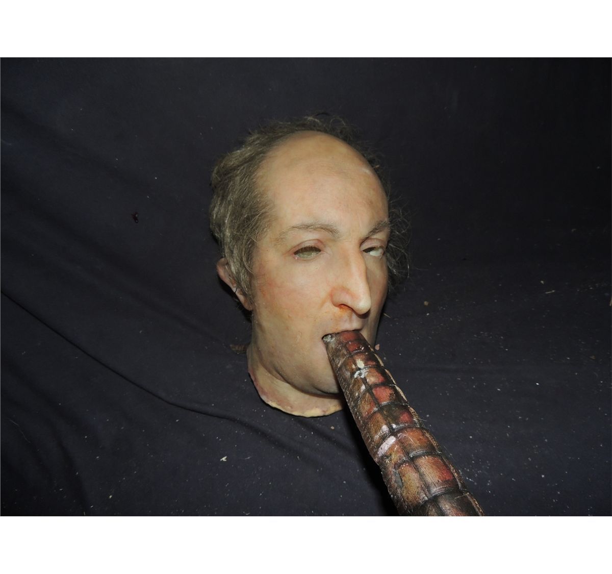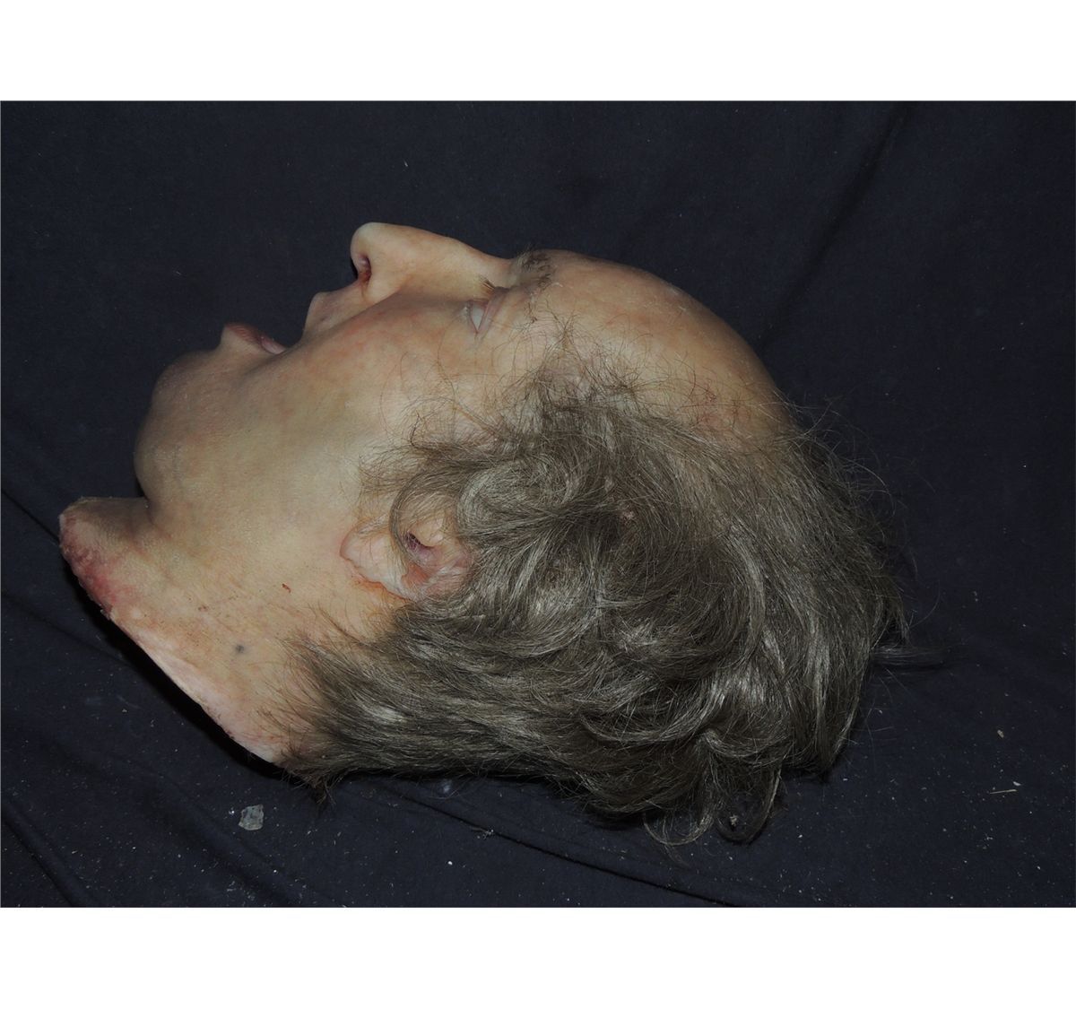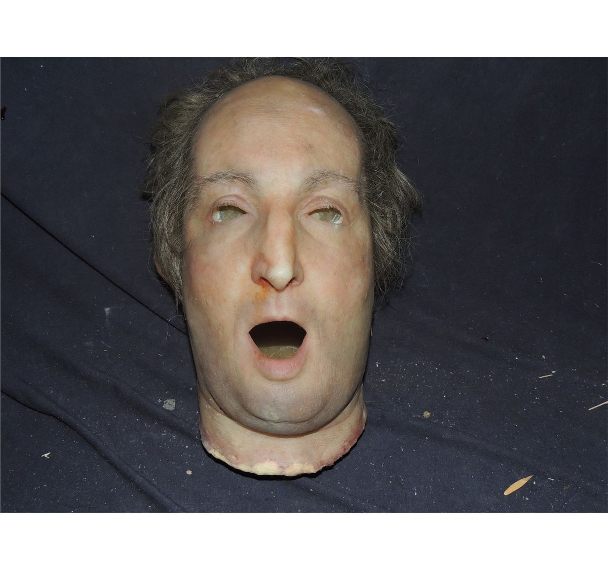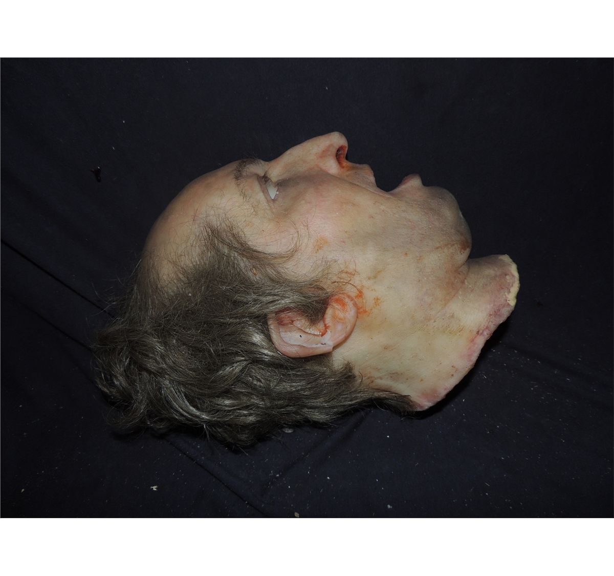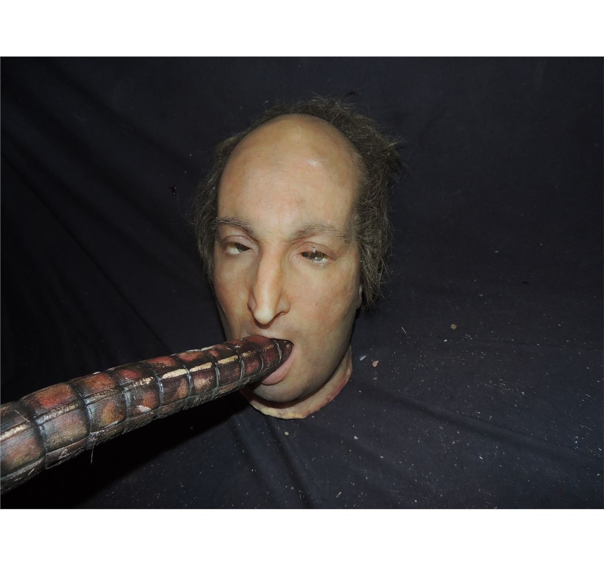 This is a silicone on fiberglass severed head rig with hand punched hairs. I believe this was also SCREEN USED in SPECIES 3. Another victim of SIL. This one she choked to death with one of her tentacles.