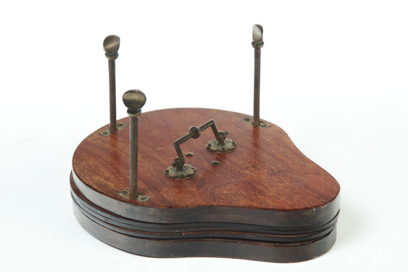 American or European, 19th century, mahogany. Shaped boards with three leaves and three brass screws. 8"h. 14 1/2"l.