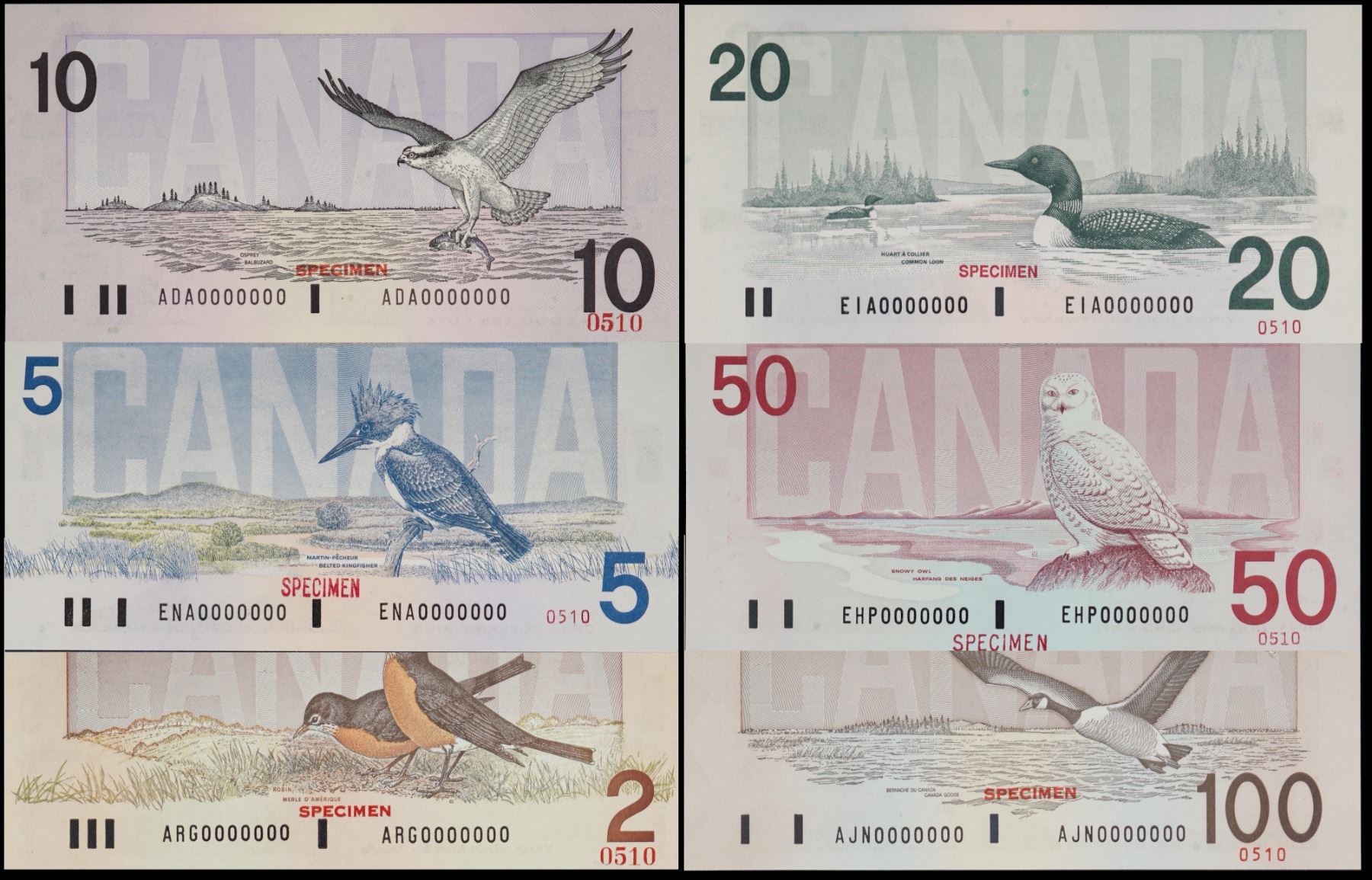 SPECIMEN Set; Bird series1986-1991 $5 to $100 - 6 note set! #0000000, #510, all Legacy graded Choice