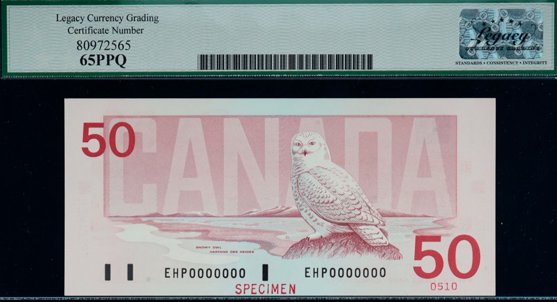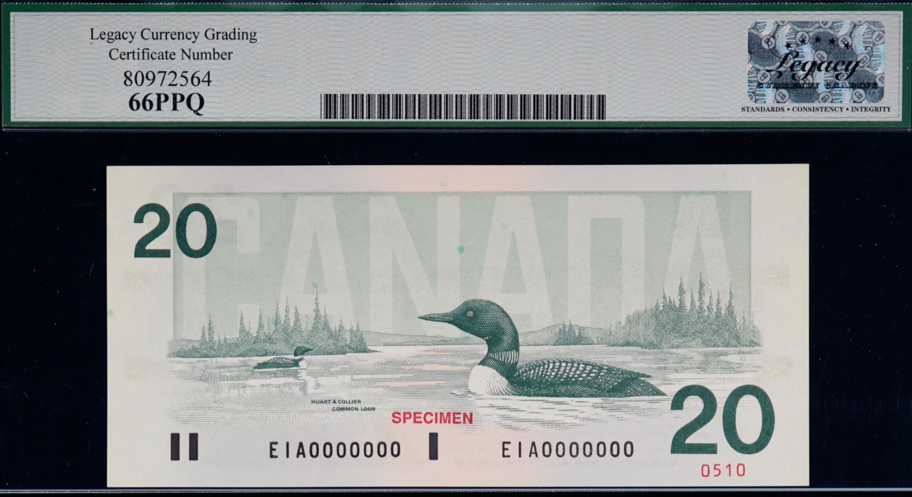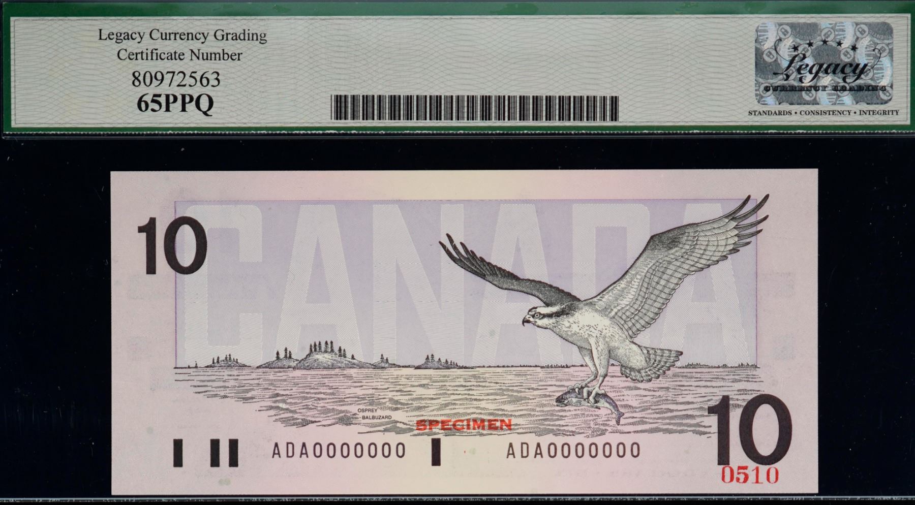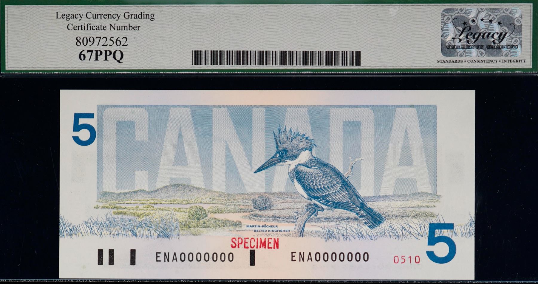 SPECIMEN Set; Bird series1986-1991 $5 to $100 - 6 note set! #0000000, #510, all Legacy graded Choice Uncirculated-63 to Superb Gem Uncirculated-67PPQ- Very attractive and desirable.