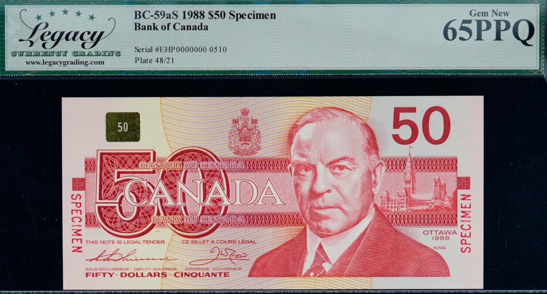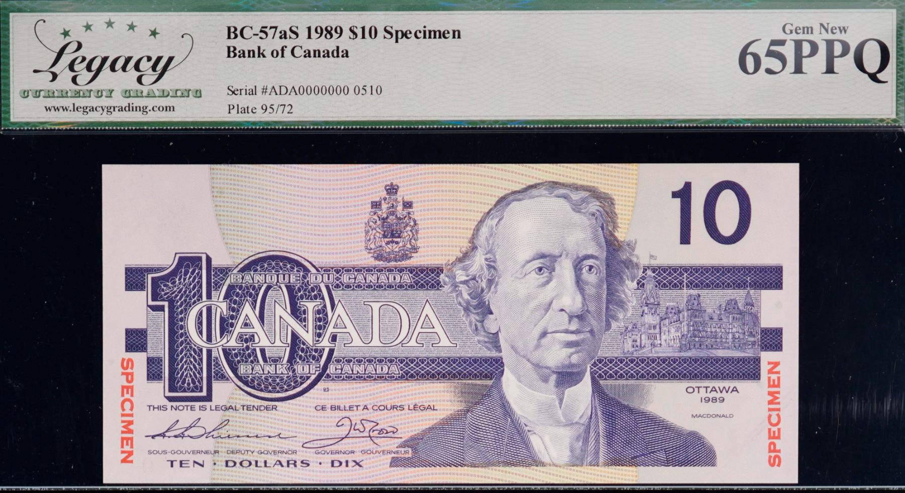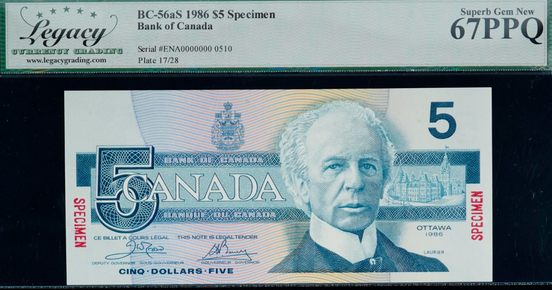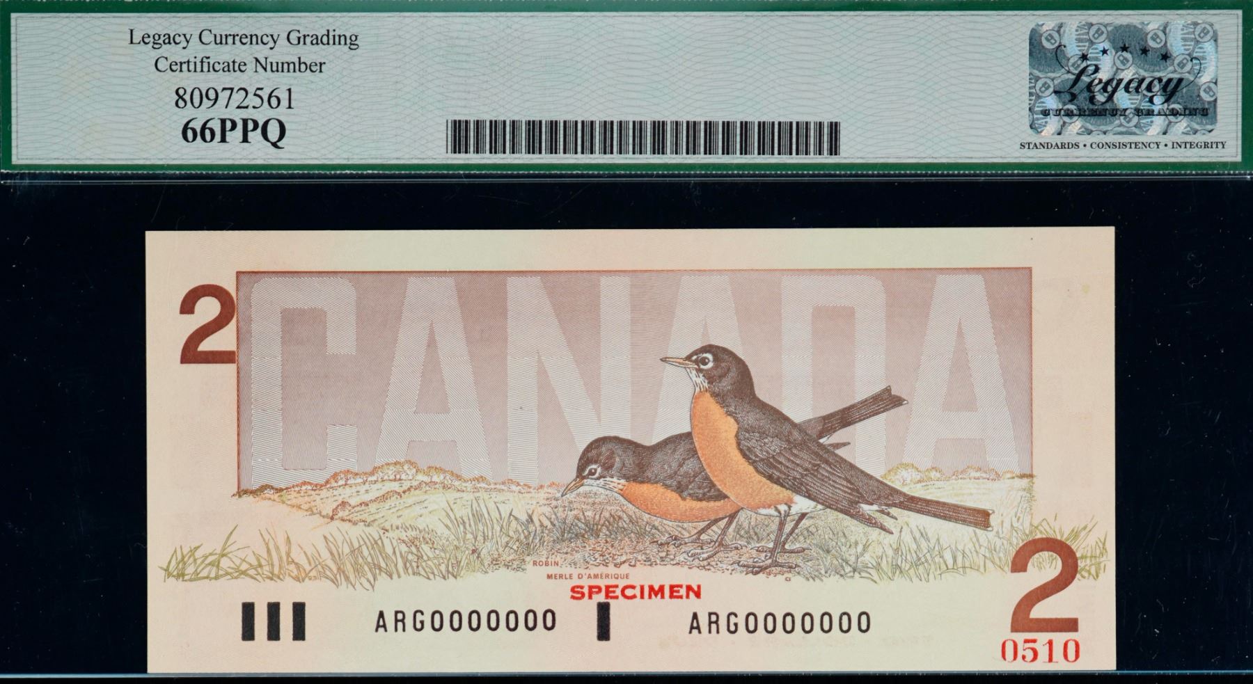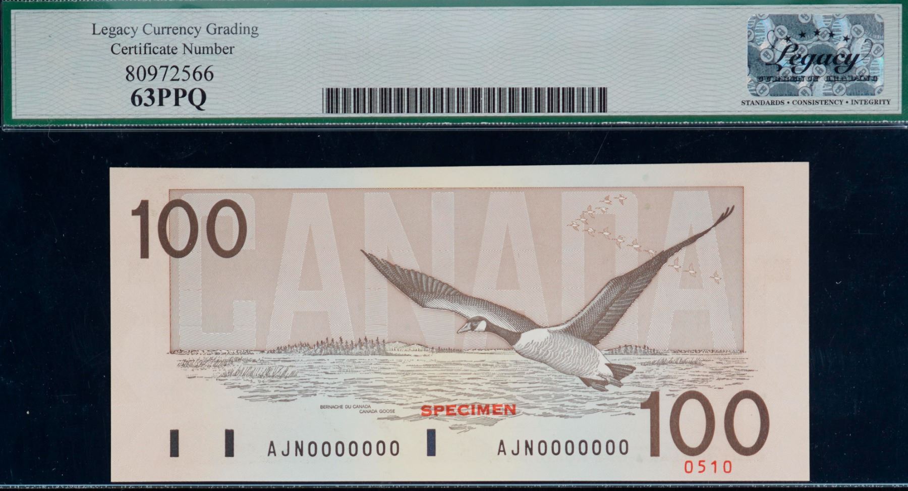 SPECIMEN Set; Bird series1986-1991 $5 to $100 - 6 note set! #0000000, #510, all Legacy graded Choice Uncirculated-63 to Superb Gem Uncirculated-67PPQ- Very attractive and desirable.