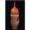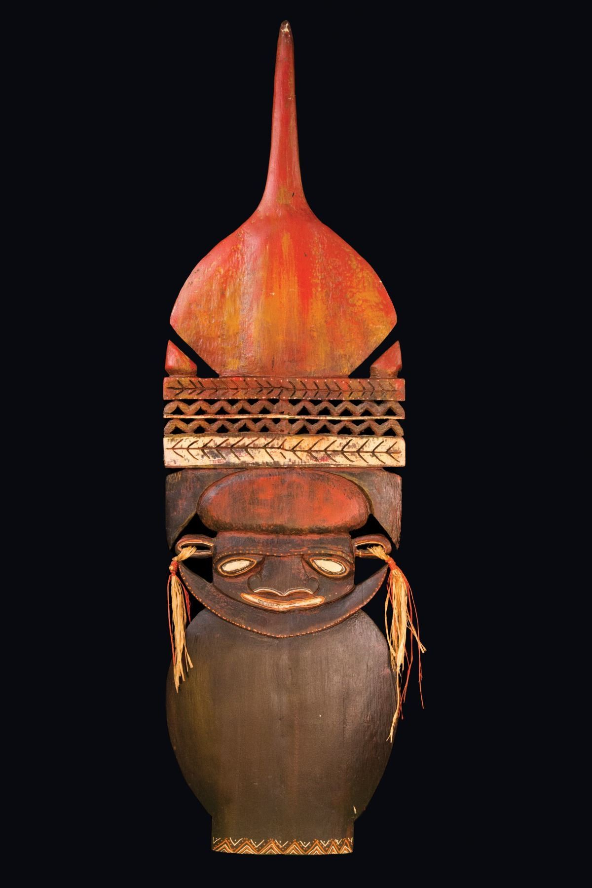 (1980s) Fully carved hardwood with excellent polychroming and raffia adornment by LeRoy Schmaltz. This impressive carving is two-sided. 61"x17"x2". VG+ with typical wear.