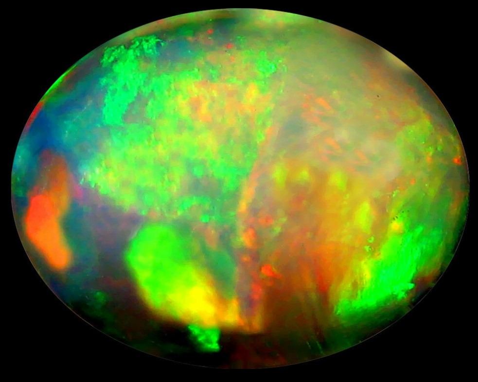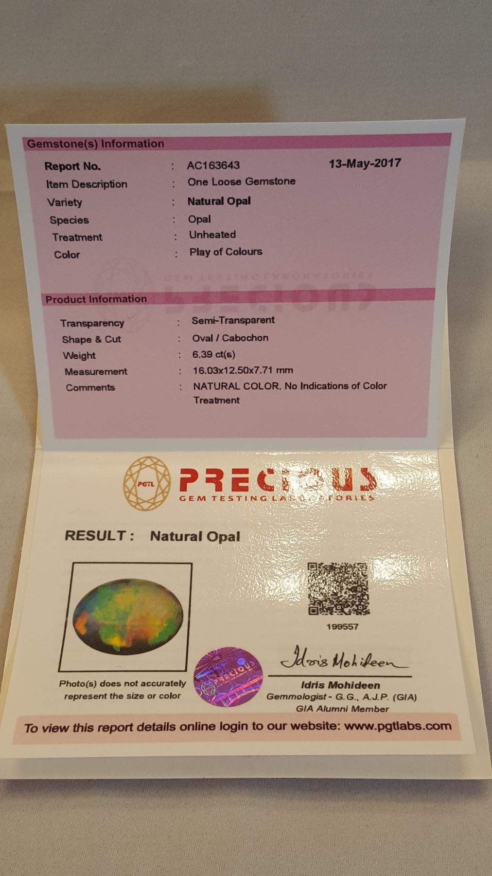SPECTACULAR 6.39 CT CERTIFIED MULTI COLOR PLAY AUSTRALAIN OPAL. DISPLYING BUT NOT LIMITED TO BRILLIANT BURSTS OF RED, GREEN, BLUE , ORANGE AND PINK AND BLUE FLASHES THROUGH A TRANSLUCENT BODY. GORGEOUS CABOCHON CUT. UNHEATED . THIS LARGE CT SIZE OPAL IS UNTREATED 100 % NATURAL . PLEASE SEE CERTIFICATION FOR FURTHER DETAILS. PICTURES CAN'T UNVEIL THE BEAUTY OF THIS HIGH GRADE INVESTMENT OPAL.READT TO MOUNT. DON'T MISS THIS ONE !