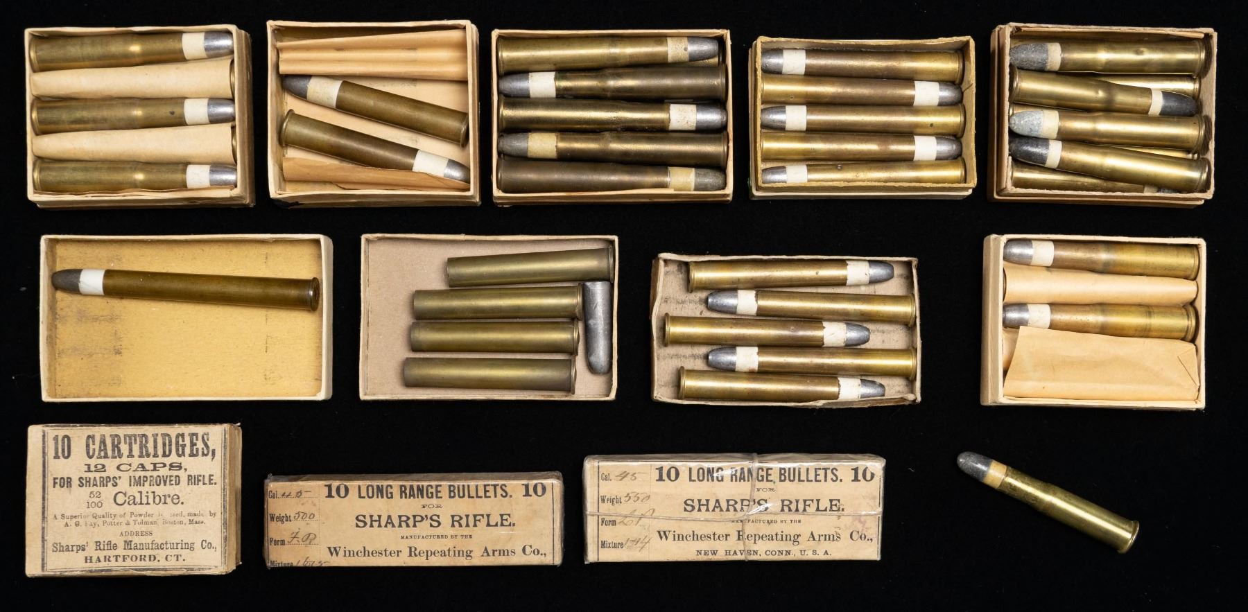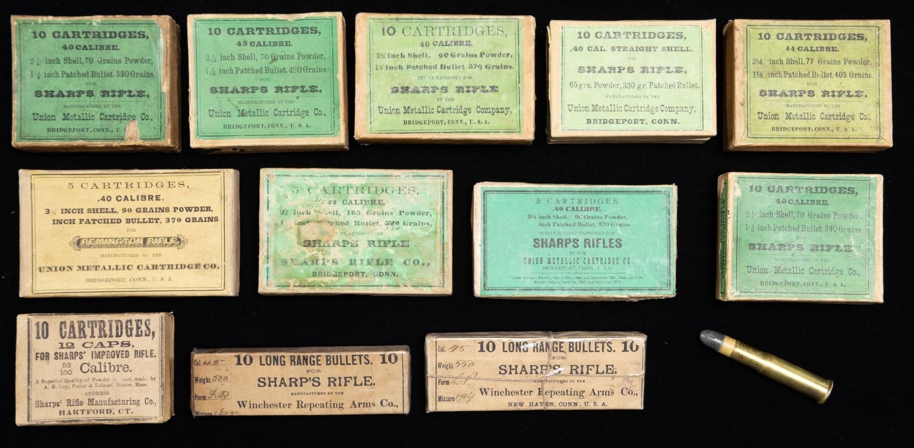 Most is by UMC with some by Sharps plus some bullets only by Winchester. All items in remarkable condition with full descriptions to follow. SHARPS: 1) Good 5 rd. box remarked from 44 to 45 caliber with "2 5/8" lined out plus grains changed from 520 to 550. Contains 4 primed cases measuring 2.582", 2.592", 2.606" and 2.647" plus 550 grain bullet measuring .444". 2) Very good natural colored 10 rd. box that is still hinged at rear. Contains 5 patched cartridges with primers; great condition. Listed for Sharps 52/100 Improved Rifle. WINCHESTER: 3) Very good box of 10 Long Range Bullets for Sharp's Rifle in 45 caliber weighing 550 grains. Sealed with vintage string wrap and currently has clear plastic food wrap. 4) Same as previous but no string and 500 grains. UMC Co.: 5) Very good 10 rd. box containing 2 great looking cartridges of 45 caliber; 2 1/10" with patched 420 grain bullet and 70 grains of powder. 6) Very good 10 rd. box containing 9 cartridges of 44 caliber 2 1/4" with patched 405 grain bullets and 77 grains of powder. Nice appearing ammo with 1 cleaned bright casing and 1 with 2 splits on its neck. 7) Very nice 10 rd. box containing 5 great looking 40 caliber Straight Shell cartridges with 330 grain patched bullet and 65 grains of powder. 8) Very good 10 rd. box full of nice 40 caliber cartridges of 2 5/8" having 1 1/4" Patched Bullet of 370 grains plus 90 grains of powder. 9) Good and very good (1 of each) 10 rd. box full of great 40 caliber cartridges of 2 1/4" having 1 1/8" Patched Bullet of 330 grains plus 70 grains of powder. Includes 1 extra cartridge. 10) Very good buff colored 5 rd. box with 1 good 40 caliber 3 1/4" cartridge having Patched Bullet of 370 grains plus 90 grains of powder. 11) Very good green labeled 5 rd. box full of good 40 caliber 3 1/4" cartridge having Patched Bullet of 370 grains plus 90 grains of powder. (02-24833/NW). NON-GUN. $1,800-2,500.