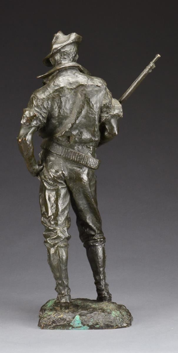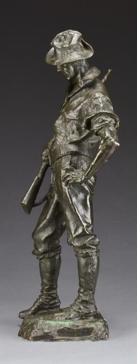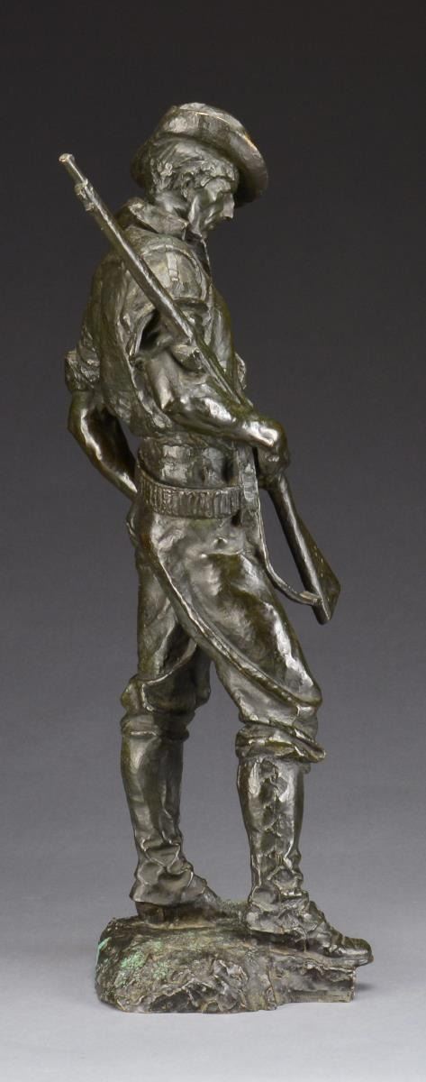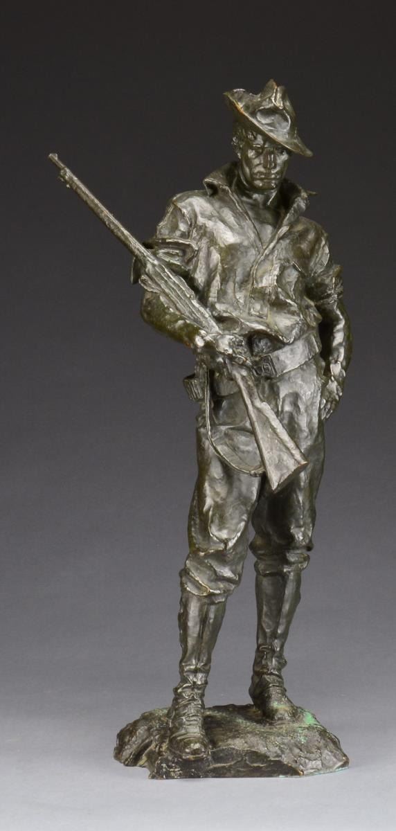 FROM SPANISH-AMERICAN WAR BY ALLEN GEORGE NEWMAN (1875-1940). This magnificent bronze was created by Allen George Newman. Newman was an American sculptor born in New York & studied under his brother-in-law, John Quincy Adams Ward, & at the National Academy of Design. Most of his works were chiefly monumental works for parks, cemeteries, etc. Other examples of his monumental work include the “Triumph of Peace” in the Piedmont Park in Atlanta, Georgia; “General Sheridan” in Scranton, Pennsylvania; however, his most famous work was this example here known as “The Hiker”. “The Hiker” was described by sculptor, Laredo Taft “as the best bronze soldier in America”. The monumental version of “The Hiker” was also first installed as part of a memorial in the North Burial ground in Providence, Rhode Island in the section for Spanish-American War dead. For a time, “The Hiker” served as the official monument of the United Spanish War Veterans (USWV). Newman’s image of “The Hiker” bears resemblance to an image created in 1899 by one of America’s famous artists, Frederick Remington, who sketched a pose of a Rough Rider while he was a war correspondent in Cuba. Indeed “The Hiker” represents a Spanish-American War Soldier & in addition to holding the military issue of the day, a Krag rifle, he also has a U.S. brass belt buckle on his belt & a cartridge pouch. There is no question that “The Hiker” actually represents a US Rough Rider Soldier. The bronze is signed on the base, “Copyright 1904 by Allen G. Newman, sculptor”. The opposite side of the base also signed, “JNO William Inc Bronze Foundry, New York”. SIZE: Approx. 28” h x 9” across base. CONDITION: The bronze is in wonderful original untouched condition. The base does exhibit some scattered verdigris. A truly historic, iconic & wonderful American bronze figure. (02-14683). $8,000-12,000.