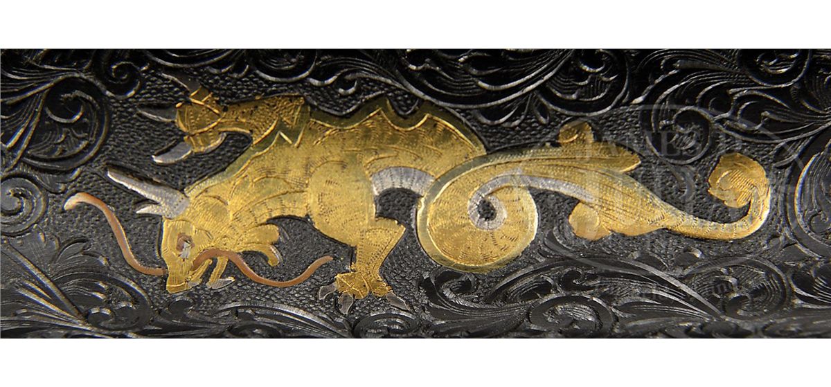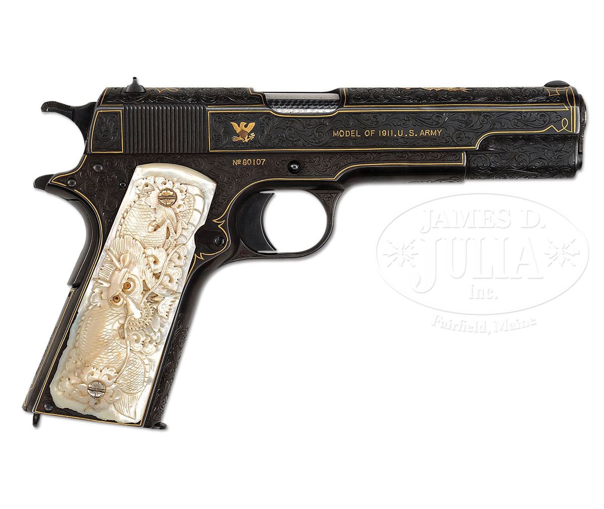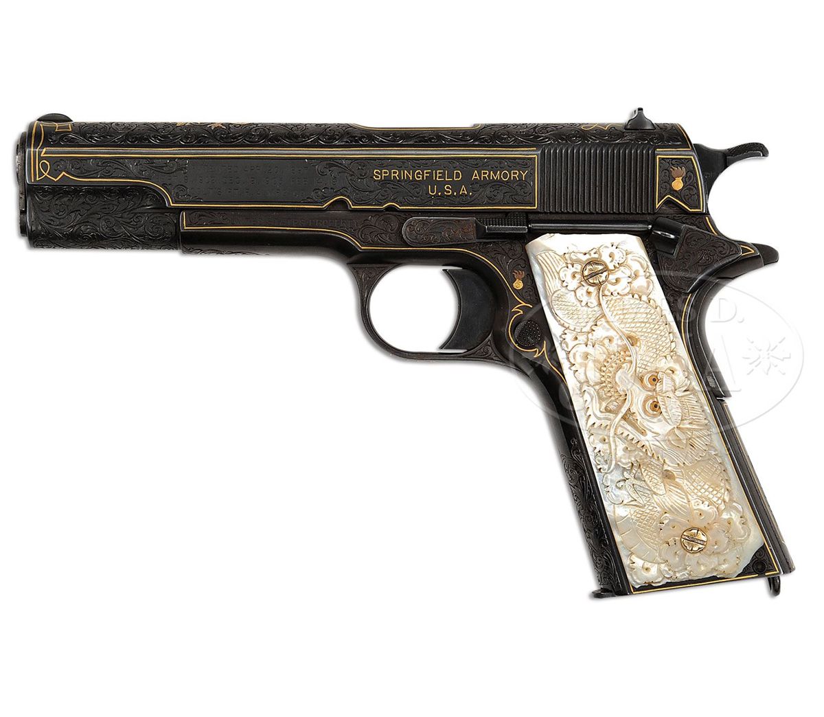 SN 80107. Cal. 45 ACP. Usual configuration with 5" bbl that has engine turned exposed skirt, fixed sights and is mounted with spectacular relief carved pearl grips in the form of incredibly detailed dragons that have amber eyes. Pistol has nearly full coverage, highly detailed, intertwined foliate arabesque pattern engraving with fine stippled background. The entire sides of frame and slide are outlined in flat gold wire. Left side of frame and left rear side of slide have had the Springfield flaming bomb inlaid in two. Right side of frame has the SN inlaid in gold and right side of slide is inlaid with a 2-color raised gold American eagle and "MODEL OF 1911. U.S. ARMY" inlaid in flat gold. Top of slide is inlaid with a spectacular 2-color raised gold dragon with very intricate geometric patterns around front sight and forward of rear sight. Spring housing and bottom of trigger bow have inlaid gold to match. Baseplate of magazine is matching engraved as are the slide lock and thumb safety. Grip screws are also engraved and gold plated. Mr. Cargnell's signature is on the bottom left side of the grip frame, under the grip. Gino Cargnell was an engraver employed at Fabrique Nationale in Belgium when his friend and mentor Angelo Bee immigrated to the United Sates and set up his own business. Mr. Bee convinced Mr. Cargnell to also come to the U.S. and work with him, which he did, to great success. Mr. Cargnell is one of the premier engravers in recent years and has created numerous, fantastic works of art on firearms. CONDITION: Extremely fine. Overall retains virtually all of its fine custom blue. Grips are spectacular with one eye on the right side missing its tiny black pupil. Mechanics are fine, very bright shiny bore. 4-49180 JR247