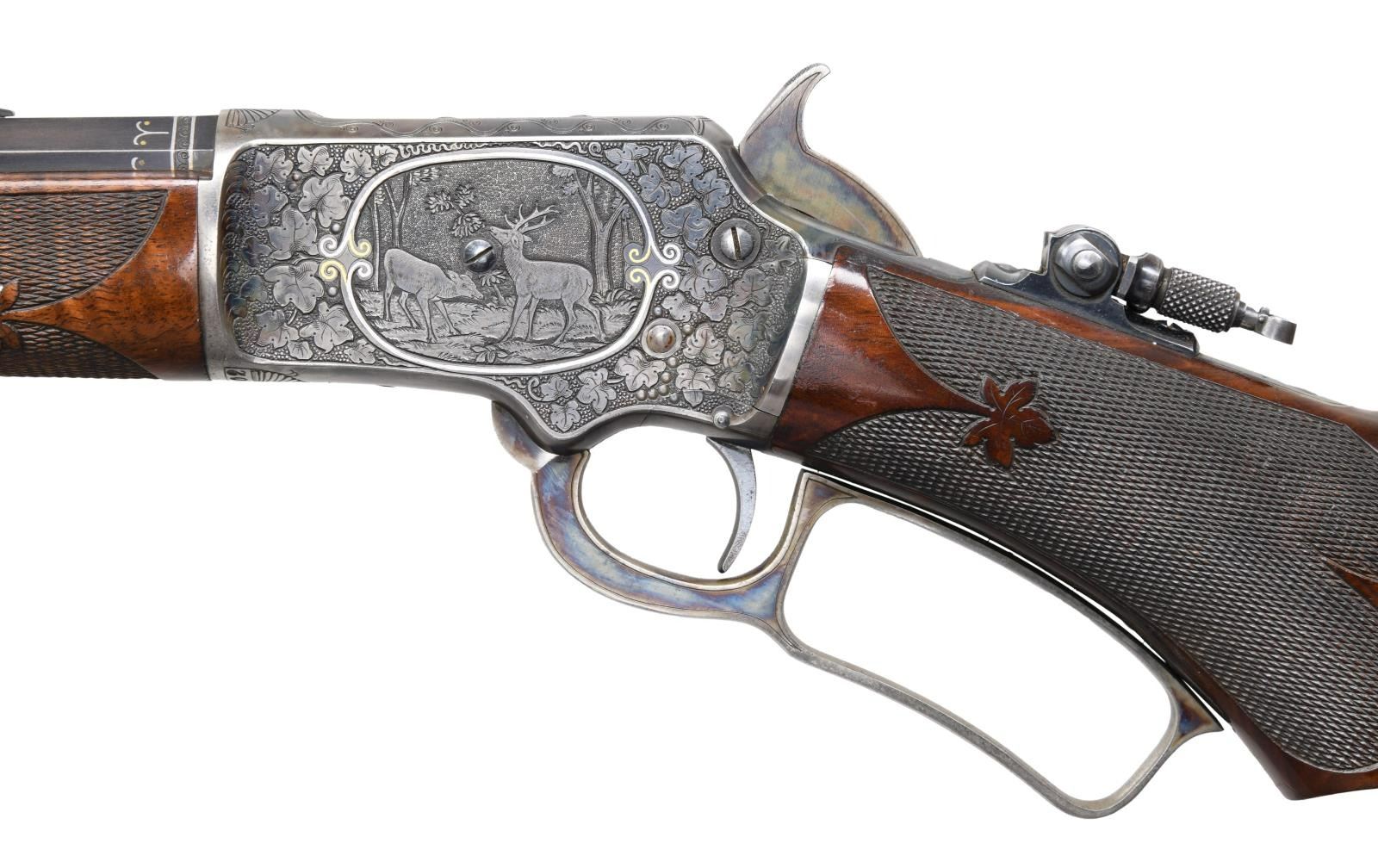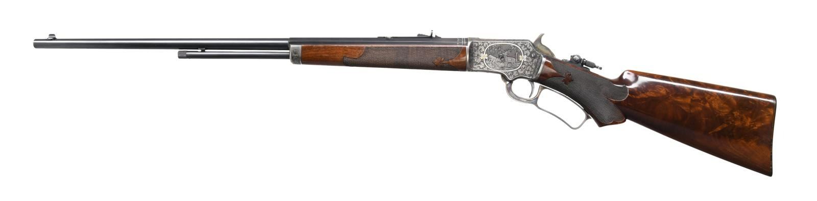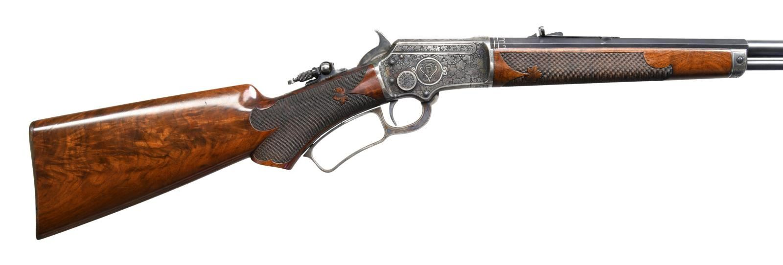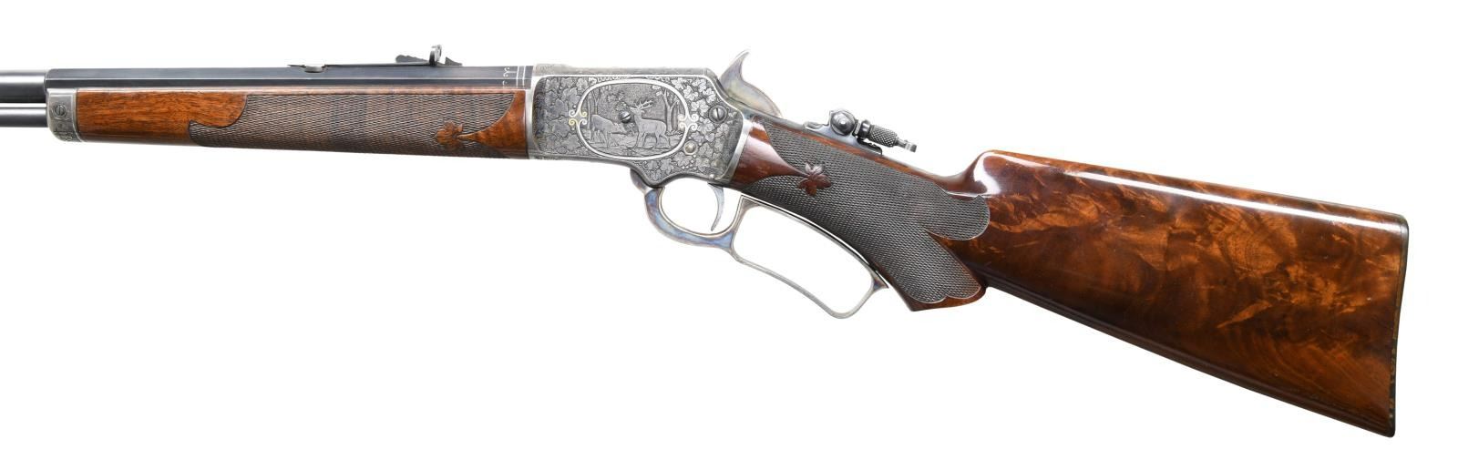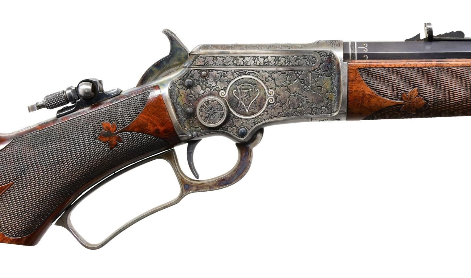 #10 ENGRAVED DELUXE MARLIN 1897 LEVER ACTION RIFLE, I.D.’D TO F.E. VENESS, A LUMBER BARON FROM WASHINGTON; EX-FRANK KELLY COLLECTION, PROBABLY THE FINEST IN EXISTENCE. CAL. 22 S, L, LR. S#. 331602. This extraordinary rifle was remarked as likely one of a kind by Mr. J.R. LaRue during his review of this rifle when it was initially offered from the Frank Kelly collection. It is fitted with a 24" octagonal to round barrel, half magazine, Lyman bead front sight, semi-buckhorn rear sight & Lyman combination tang sight. The receiver exhibits a wonderfully executed special #10 engraving pattern by the hand of master engraver Conrad Ulrich. The left side features a well-cut forest scene of a whitetail buck & doe feeding on a sapling and bordered within a platinum and gold vignette, finished with tight full coverage leafy vine & punch dot engraving. The opposite receiver face is engraved with the intertwined initials “FEV” inside a platinum and gold outlined vignette, with the “V” also finished in platinum, it is further embellished with a small squirrel within the vine and leaf pattern. The top, bottom, & tang of the receiver are also tastefully engraved with wavy line and dot borders & a fanned burst on the top of the frame, nose cap, & below the serial number. The lever and hammer are borderline engraved. Ulrich further engraved and inlaid the exposed barrel flats over the chamber with latch and hook patterns, as well as, platinum and gold bands and designs. The nose cap is accented with a fine platinum line around the top and rear edges and includes a matching foliate motif engraving. The initials are verified as being that of Fred Eugene Veness with a notarized letter dated Dec. 12th 2003 from his grandson John A Veness. John states in the letter that the rifle had been a family heirloom passed down to him and was originally delivered from the factory to his grandfather in 1906. The Veness family was involved in the lumber business as both a lumber company and a holding company for lumber companies in Winlock, WA from approximately 1890 until 1931. Family lore indicated it was a gift to Fred for financing a mill in Winlock. In 1997 the grandson displayed the firearm at the Marlin Firearms Collectors Association booth at the NRA meeting where it then received the silver award for one of the top 10 best firearms at the show. The letter indicates that the grandson sold the rifle to Bennett Auslaender in late 2000 who retained the rifle until it was sold to collector Frank Kelly in 2005. The wonderful attention to detail that was given to the metal extends to the stock set with a highly figured burl and shell grained American walnut featuring a serpentine grip cut with a #10 checkering pattern and terminated with a hard rubber Marlin factory buttplate. The last three digits of the serial number is marked on both the upper tang under the wood and the top tang channel of the stock. The gun letters within configuration and indicates it was shipped Jan. 18th 1906. UNATTACHED ACCESSORIES: Factory letter, Bill of sale and correspondences between Auslaender & Kelly, Notarized letters from both John Veness & Bennett Auslaender, silver award and plaque from the 1997 NRA meeting, & a copy of “The Timber Baron of Winlock” by Wayne Galvin detailing the history of the timber industry in Winlock, WA with the a considerable amount of the book chronicling the tenure of Fred Eugene Veness. CONDITION: This rifle remains in extraordinarily fine all matching original condition. Barrel and magazine retain 98-99% strong original blue with some light wear on the rear sight, muzzle & high edges. The receiver retains the vast majority of its original case colors that is mildly fading and darker than the more protected areas. The lever and hammer show bright vivid case coloring with the outer surfaces of these parts and the nosecap fading to silver The stock set retains 95-98% of its original varnish with mild point wear to the checkering. The buttplate tone has faded lightly and has a small chip on the right side. Bright bore with very good rifling showing only minor scattered spots. A magnificent rifle that was tastefully built and finished for a Northwest Timber Baron and is believed to be one of the finest in existence. PROVENANCE: Ex- Veness Family Heirloom 1906-2003, Ex- Bennett Auslaender Collection, 2003-2005, Ex- Frank Kelly Collection 2005-2015, & William Blount Collection of Extraordinary Marlins. (24-1646/ZAL) CURIO. $60,000-80,000.