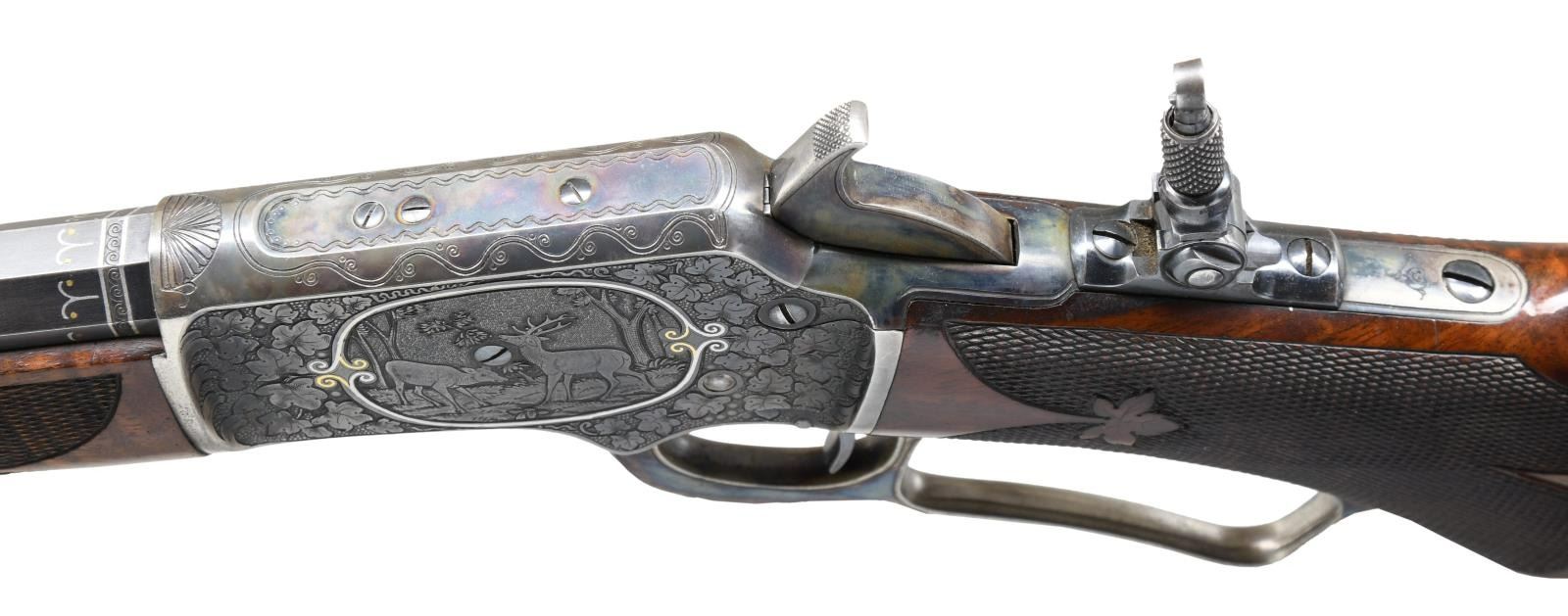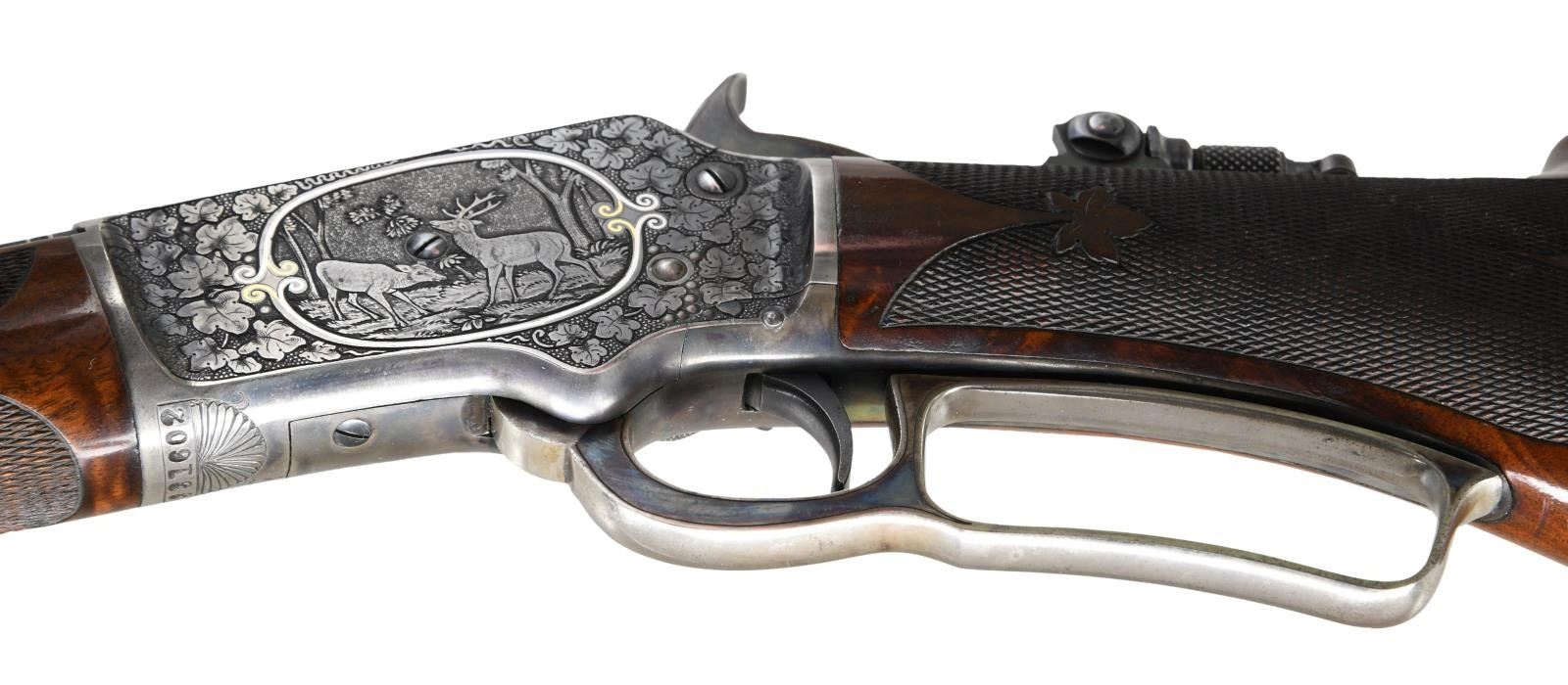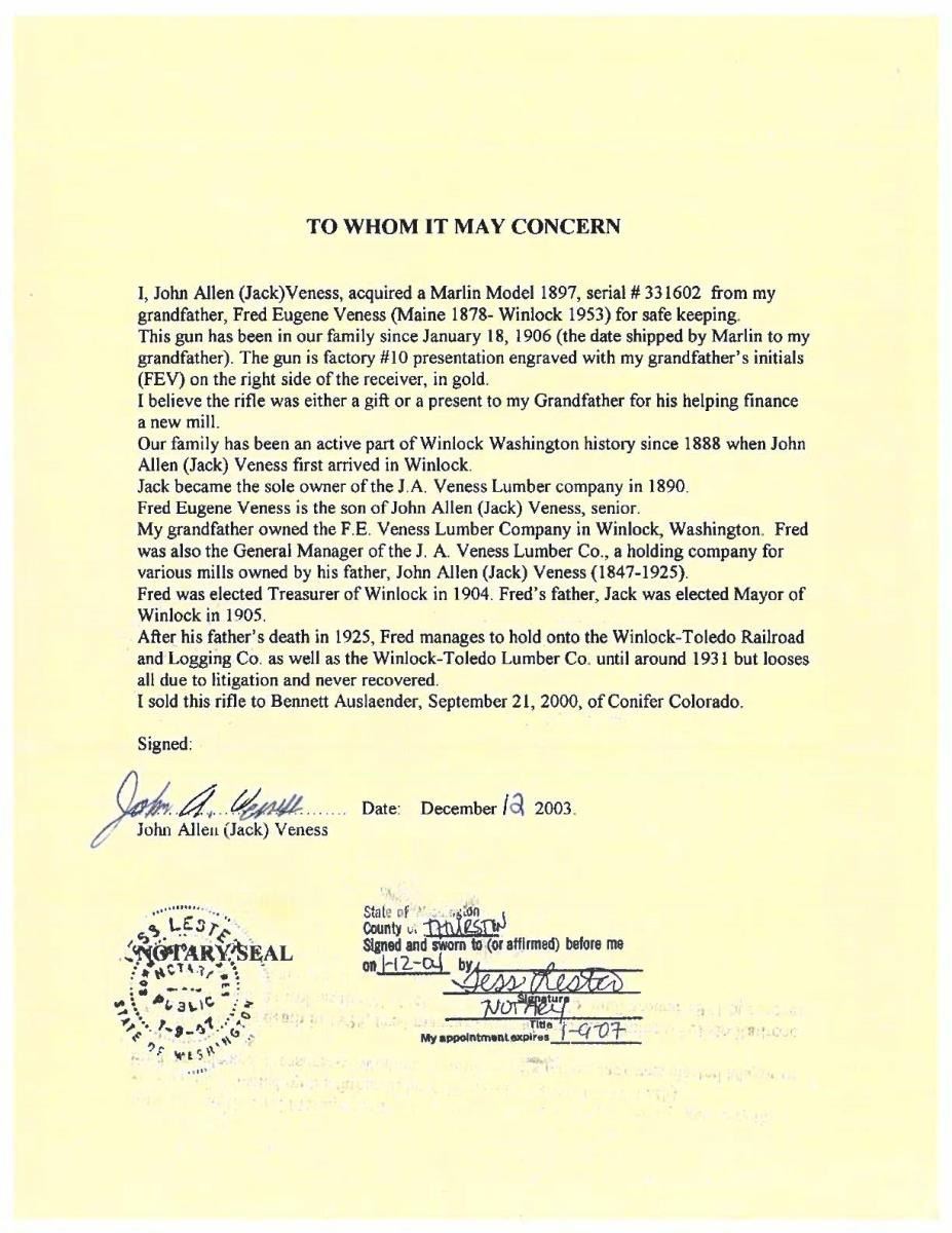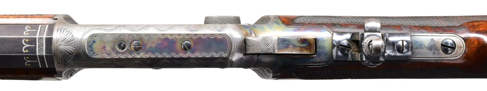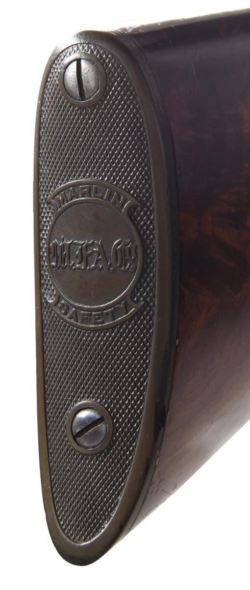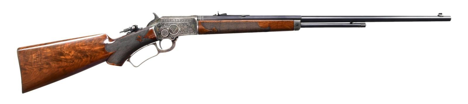 #10 ENGRAVED DELUXE MARLIN 1897 LEVER ACTION RIFLE, I.D.’D TO F.E. VENESS, A LUMBER BARON FROM WASHINGTON; EX-FRANK KELLY COLLECTION, PROBABLY THE FINEST IN EXISTENCE. CAL. 22 S, L, LR. S#. 331602. This extraordinary rifle was remarked as likely one of a kind by Mr. J.R. LaRue during his review of this rifle when it was initially offered from the Frank Kelly collection. It is fitted with a 24" octagonal to round barrel, half magazine, Lyman bead front sight, semi-buckhorn rear sight & Lyman combination tang sight. The receiver exhibits a wonderfully executed special #10 engraving pattern by the hand of master engraver Conrad Ulrich. The left side features a well-cut forest scene of a whitetail buck & doe feeding on a sapling and bordered within a platinum and gold vignette, finished with tight full coverage leafy vine & punch dot engraving. The opposite receiver face is engraved with the intertwined initials “FEV” inside a platinum and gold outlined vignette, with the “V” also finished in platinum, it is further embellished with a small squirrel within the vine and leaf pattern. The top, bottom, & tang of the receiver are also tastefully engraved with wavy line and dot borders & a fanned burst on the top of the frame, nose cap, & below the serial number. The lever and hammer are borderline engraved. Ulrich further engraved and inlaid the exposed barrel flats over the chamber with latch and hook patterns, as well as, platinum and gold bands and designs. The nose cap is accented with a fine platinum line around the top and rear edges and includes a matching foliate motif engraving. The initials are verified as being that of Fred Eugene Veness with a notarized letter dated Dec. 12th 2003 from his grandson John A Veness. John states in the letter that the rifle had been a family heirloom passed down to him and was originally delivered from the factory to his grandfather in 1906. The Veness family was involved in the lumber business as both a lumber company and a holding company for lumber companies in Winlock, WA from approximately 1890 until 1931. Family lore indicated it was a gift to Fred for financing a mill in Winlock. In 1997 the grandson displayed the firearm at the Marlin Firearms Collectors Association booth at the NRA meeting where it then received the silver award for one of the top 10 best firearms at the show. The letter indicates that the grandson sold the rifle to Bennett Auslaender in late 2000 who retained the rifle until it was sold to collector Frank Kelly in 2005. The wonderful attention to detail that was given to the metal extends to the stock set with a highly figured burl and shell grained American walnut featuring a serpentine grip cut with a #10 checkering pattern and terminated with a hard rubber Marlin factory buttplate. The last three digits of the serial number is marked on both the upper tang under the wood and the top tang channel of the stock. The gun letters within configuration and indicates it was shipped Jan. 18th 1906. UNATTACHED ACCESSORIES: Factory letter, Bill of sale and correspondences between Auslaender & Kelly, Notarized letters from both John Veness & Bennett Auslaender, silver award and plaque from the 1997 NRA meeting, & a copy of “The Timber Baron of Winlock” by Wayne Galvin detailing the history of the timber industry in Winlock, WA with the a considerable amount of the book chronicling the tenure of Fred Eugene Veness. CONDITION: This rifle remains in extraordinarily fine all matching original condition. Barrel and magazine retain 98-99% strong original blue with some light wear on the rear sight, muzzle & high edges. The receiver retains the vast majority of its original case colors that is mildly fading and darker than the more protected areas. The lever and hammer show bright vivid case coloring with the outer surfaces of these parts and the nosecap fading to silver The stock set retains 95-98% of its original varnish with mild point wear to the checkering. The buttplate tone has faded lightly and has a small chip on the right side. Bright bore with very good rifling showing only minor scattered spots. A magnificent rifle that was tastefully built and finished for a Northwest Timber Baron and is believed to be one of the finest in existence. PROVENANCE: Ex- Veness Family Heirloom 1906-2003, Ex- Bennett Auslaender Collection, 2003-2005, Ex- Frank Kelly Collection 2005-2015, & William Blount Collection of Extraordinary Marlins. (24-1646/ZAL) CURIO. $60,000-80,000.