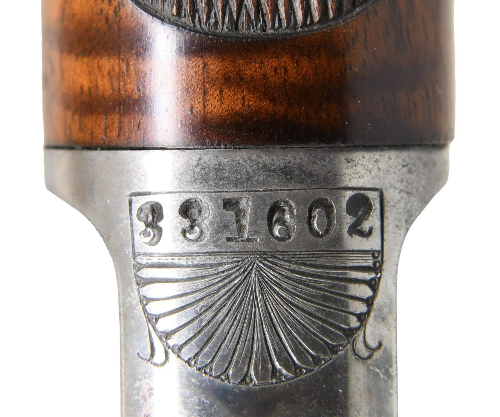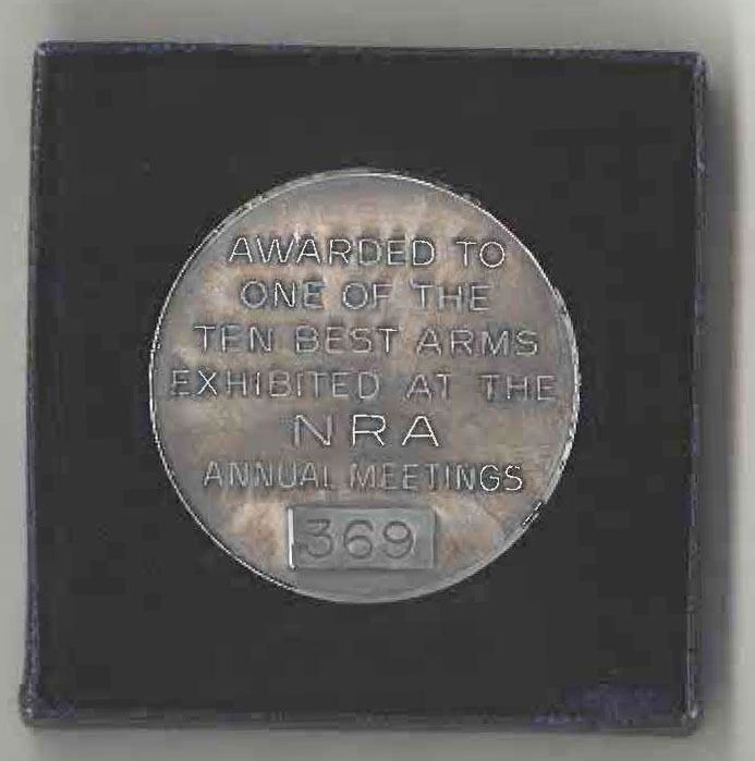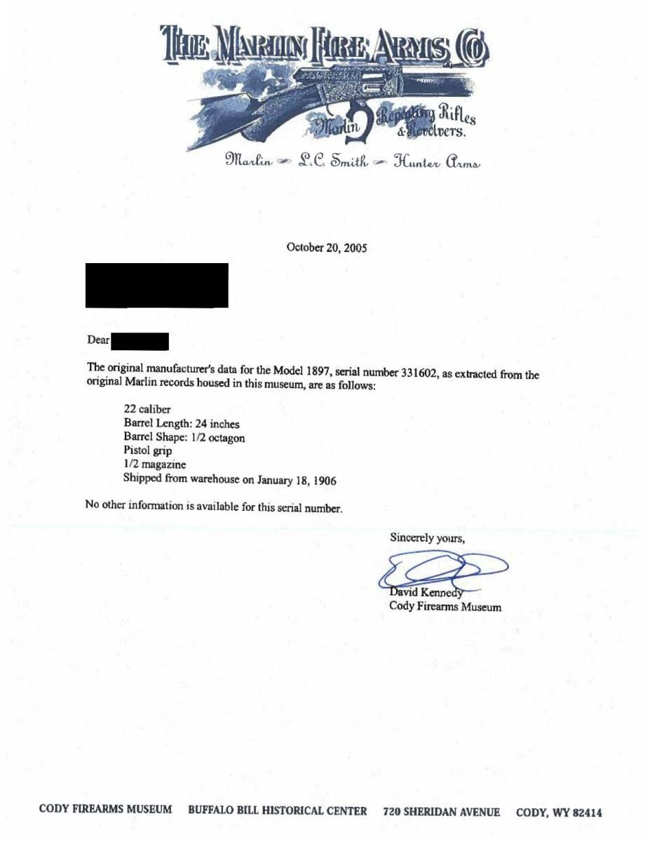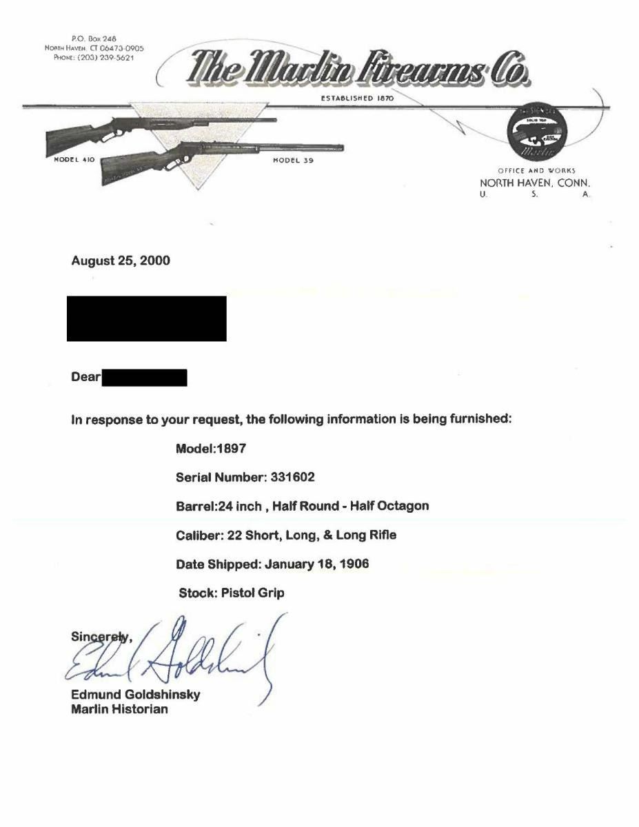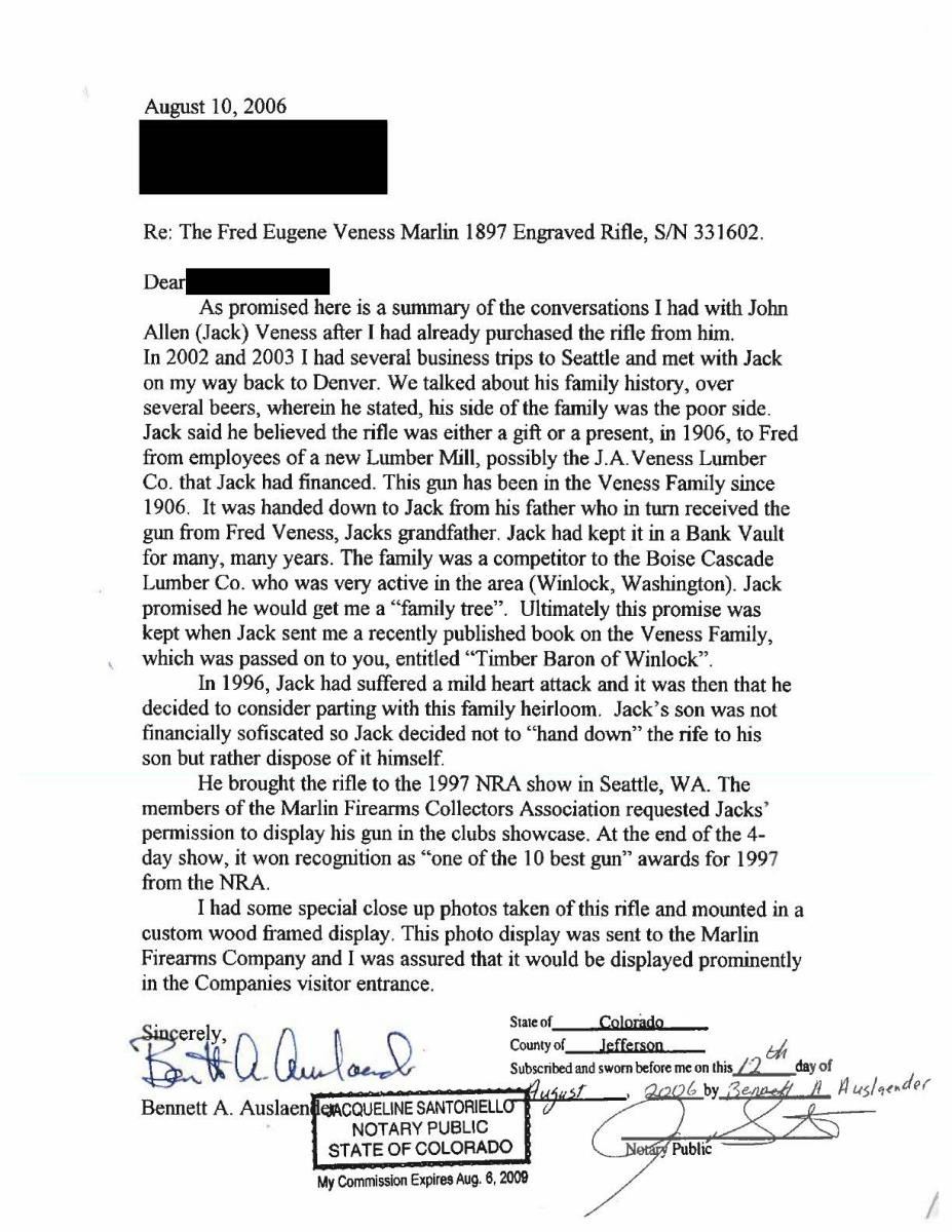 #10 ENGRAVED DELUXE MARLIN 1897 LEVER ACTION RIFLE, I.D.’D TO F.E. VENESS, A LUMBER BARON FROM WASHINGTON; EX-FRANK KELLY COLLECTION, PROBABLY THE FINEST IN EXISTENCE. CAL. 22 S, L, LR. S#. 331602. This extraordinary rifle was remarked as likely one of a kind by Mr. J.R. LaRue during his review of this rifle when it was initially offered from the Frank Kelly collection. It is fitted with a 24" octagonal to round barrel, half magazine, Lyman bead front sight, semi-buckhorn rear sight & Lyman combination tang sight. The receiver exhibits a wonderfully executed special #10 engraving pattern by the hand of master engraver Conrad Ulrich. The left side features a well-cut forest scene of a whitetail buck & doe feeding on a sapling and bordered within a platinum and gold vignette, finished with tight full coverage leafy vine & punch dot engraving. The opposite receiver face is engraved with the intertwined initials “FEV” inside a platinum and gold outlined vignette, with the “V” also finished in platinum, it is further embellished with a small squirrel within the vine and leaf pattern. The top, bottom, & tang of the receiver are also tastefully engraved with wavy line and dot borders & a fanned burst on the top of the frame, nose cap, & below the serial number. The lever and hammer are borderline engraved. Ulrich further engraved and inlaid the exposed barrel flats over the chamber with latch and hook patterns, as well as, platinum and gold bands and designs. The nose cap is accented with a fine platinum line around the top and rear edges and includes a matching foliate motif engraving. The initials are verified as being that of Fred Eugene Veness with a notarized letter dated Dec. 12th 2003 from his grandson John A Veness. John states in the letter that the rifle had been a family heirloom passed down to him and was originally delivered from the factory to his grandfather in 1906. The Veness family was involved in the lumber business as both a lumber company and a holding company for lumber companies in Winlock, WA from approximately 1890 until 1931. Family lore indicated it was a gift to Fred for financing a mill in Winlock. In 1997 the grandson displayed the firearm at the Marlin Firearms Collectors Association booth at the NRA meeting where it then received the silver award for one of the top 10 best firearms at the show. The letter indicates that the grandson sold the rifle to Bennett Auslaender in late 2000 who retained the rifle until it was sold to collector Frank Kelly in 2005. The wonderful attention to detail that was given to the metal extends to the stock set with a highly figured burl and shell grained American walnut featuring a serpentine grip cut with a #10 checkering pattern and terminated with a hard rubber Marlin factory buttplate. The last three digits of the serial number is marked on both the upper tang under the wood and the top tang channel of the stock. The gun letters within configuration and indicates it was shipped Jan. 18th 1906. UNATTACHED ACCESSORIES: Factory letter, Bill of sale and correspondences between Auslaender & Kelly, Notarized letters from both John Veness & Bennett Auslaender, silver award and plaque from the 1997 NRA meeting, & a copy of “The Timber Baron of Winlock” by Wayne Galvin detailing the history of the timber industry in Winlock, WA with the a considerable amount of the book chronicling the tenure of Fred Eugene Veness. CONDITION: This rifle remains in extraordinarily fine all matching original condition. Barrel and magazine retain 98-99% strong original blue with some light wear on the rear sight, muzzle & high edges. The receiver retains the vast majority of its original case colors that is mildly fading and darker than the more protected areas. The lever and hammer show bright vivid case coloring with the outer surfaces of these parts and the nosecap fading to silver The stock set retains 95-98% of its original varnish with mild point wear to the checkering. The buttplate tone has faded lightly and has a small chip on the right side. Bright bore with very good rifling showing only minor scattered spots. A magnificent rifle that was tastefully built and finished for a Northwest Timber Baron and is believed to be one of the finest in existence. PROVENANCE: Ex- Veness Family Heirloom 1906-2003, Ex- Bennett Auslaender Collection, 2003-2005, Ex- Frank Kelly Collection 2005-2015, & William Blount Collection of Extraordinary Marlins. (24-1646/ZAL) CURIO. $60,000-80,000.