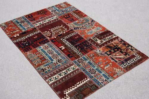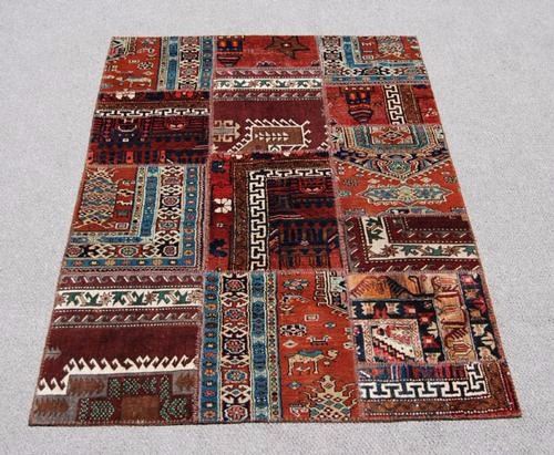 ABSOLUTELY SPECTACULAR HANDMADE SEMI ANTIQUE TURKISH PATCHWORK KILIM, SIZE 5.0 X 7.5 FEET, MADE FROM PIECES OF A SOLID BACKROUND. THE WOOL IS DYED BEFORE THE PRODUCTION OF A SOLID COLORED KILIM THAT IS LATER CUT INTO PIECES THAT ARE ARRANGED ACCORDING TO THE DESIGN AND THEN HAND SEWN TOGETHER. THE BACK OF THE KILIM IS COVERED BY A SPECIAL AND VERY RESISTANT FABRIC. THE COMBINATION OF COLOURS IS DECIDED BY EXPERT DESIGNERS THAT CAREFULLY CREATE UNIQUE PIECES. HAND WOVEN IN TURKEY.