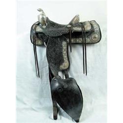 SPECTACULAR KEYSTON BROTHERS SILVER PARADE SADDLE SET. Fine tooled black leather Keyston-made saddle with 14” seat. The front of the seat has the Keyston maker’s silver plate and the back of the cantle has a large silver plate engraved "T. C. Armstrong”. The entire wide pommel is covered in heavy silver that is beautifully engraved in complete-coverage floliate and floral patterns. The shank of the horn is silver-covered and engraved to match. The horn is covered with silver and engraved in a deep rope pattern with a center concho of engraved silver with overlaid gold horse head. The saddle has double skirts with all four corners having large L-shaped engraved silver plates centered at the corners with a large rope-edged concho with gold overlaid horse head. The back of the cantle and the corner of the fenders and the bottom of the tapaderos also have rope-edged conchos with gold overlaid horse heads. The edges of the skirts, fenders, and tapaderos are completely lined with engraved rope-edged conchos, separated by engraved silver double triangles. The jockeys and fenders are deeply tooled with foliate patterns. It is accompanied by its original set of flared serapes, about 37” long by 16” wide at the bottom, of heavy untooled black leather, having full borders of matching engraved rope-edge conchos with large conchos at the corners that have overlaid gold horse heads. Centered toward the bottom of the serapes is a starburst pattern of engraved silver diamonds and tiny conchos surrounding a large central concho. The bottoms of the serape have nine 1” silver balls hanging from chains, two are missing from one side. Also accompanying is its original martingale with matching silver work and a large plate at the front center having a central raised gold standing horse. It is also accompanied by its full silver covered bridle with Crockett bit and reins, along with its wide red-and-white cinch with tooled bosses. Lastly, accompanies is its original sheepskin two-piece blanket with black and white rolled edging. CONDITION: Generally very fine. The seat is slightly faded with brown showing through the black finish. The silver appears to be completely intact except for the two missing balls from the serape. There is some slight soil and sweat stains on the serape and martingale. Overall, the leather is supple, in need of a good cleaning. Each of the tapaderos has had something removed from the outside and a large nickeled "J” installed in its place. 4-50171 JR555
