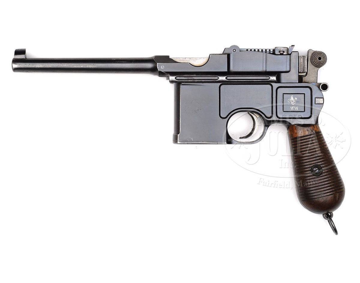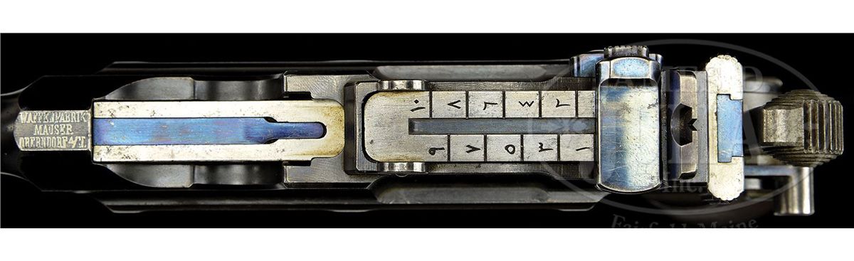SN 8. Cal. 7.63mm. The Turkish Contract was Mauser's first government contract sale of its C96. These Conehammers were assigned a separate serial range of 1-1000 and numbered in Farsi. To emphasize the crest of Sultan Abdul-Hamid II, then the ruler of Turkey, the milling on the left frame was modified to include a central island. Under the crest appear the numbers (1314), a date in the Islamic calendar, possibly when the order was placed. That converts to 1896 on the Gregorian calendar used in the West. As with all Turkish Contract C96s, this gun has a 5.5" bbl and pinned 1-10 rear sight in Farsi characters. Usual chamber address. 6-pointed star on both the left and right side of the bbl extension. Turkish crest on the central island on the left side of the frame. Detailed disassembly shows all matching parts (including the firing pin) with Farsi numerals. The six pointed star is repeated under the bolt and on the locking block. Orig lanyard ring. PROVENANCE: Dr. Geoffrey Sturgess Collection. CONDITION: This untouched gun has approximately 95% of its original blue with expected high point wear on the bbl, rails, and the magazine floorplate. Light patina to the front and back strap. Comparable condition bright fire blue on the extractor, cursor, bolt stop, safety, grip screw. Trigger is in the white as correct for this variation. Bright near-mirror bore. Most original varnish is still on grips. Likely the best Turkish contract Conehammer to be offered in the last three decades. 4-53010 LMA82