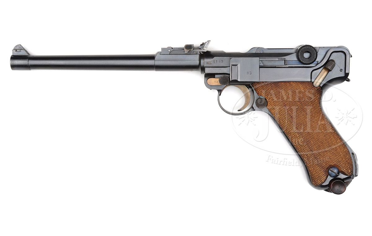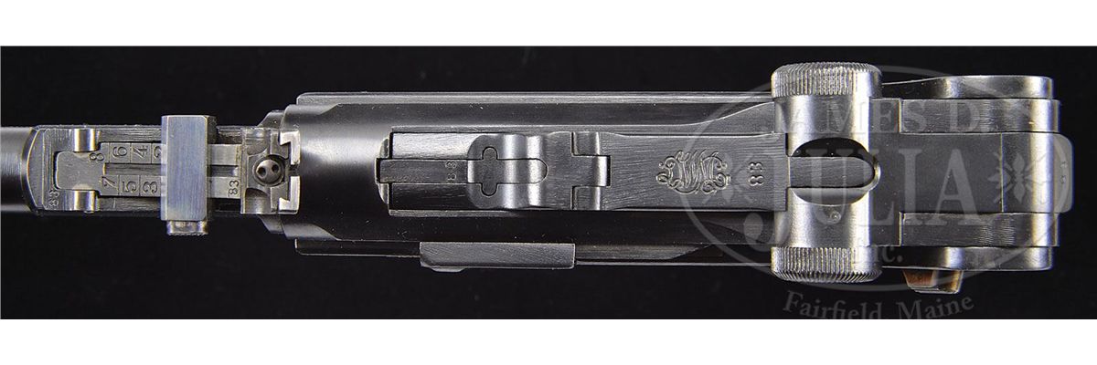 SN 1183v. 8" 9mm artillery bbl with fine tune adjustable rear sight. DWM scroll on center toggle link. Right side has three line address, receiver marked "A.F. Stoeger Inc./New York." in front of a "Germany" mark. Right frame rail is marked "Genuine Luger Registered U.S. Patent Office". Horizontal Crown/U proof on left receiver and bbl. Low V suffix range indicating Mauser assembly of DWM components. All numbered parts are matching. This gun is featured on pp. 539 and 763 of Dr. Geoffrey Sturgess' The Borchardt & Luger Automatic Pistols. This is one of the highest serial number Stoeger marked pistols known and one of the finest examples of its kind. PROVENANCE: Collection of Dr. Geoffrey Sturgess. CONDITION: Near mint retaining 99% original blue and 99% original straw. Bore is bright and sharp. Grips retain original color and sharp checkering with very little wear. Proper wood bottom magazine is in excellent condition. Mechanics are excellent. 4-52809 BWS38