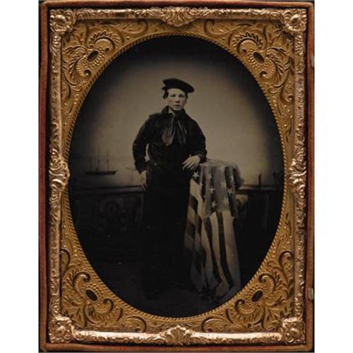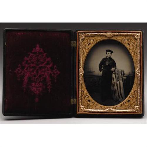 <B>SPECTACULAR UNION SAILOR - HALF PLATE TINTYPE</B></I>. A teen-aged Union sailor poses before a studio backdrop painted to resemble a Man O' War's gun deck. Behind the subject are cannon looking out to a sea upon which is a three-masted steamship. The young seaman rests his left arm upon a stand draped with the American flag. The flag's stripes and the boy's cheeks are lightly tinted, giving this image the illusion of being a color photograph. Attractive dark haloing with great tonal contrasts and pristine surfaces. A truly special Civil War Naval photograph in all respects. The image is housed in gutta-percha Union case having a floral still life embossed on both sides.<BR><B><BR>Provenance: </B></I><I>William Turner collection</B></I><BR><BR><b>Shipping:</b> Flat Material, Small (<a target="_blank" href="http://www.heritageauctions.com/common/shipping.php">view shipping information</a>)