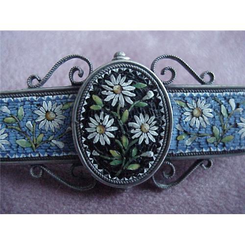 <table width="100%" border="0" cellspacing="0" cellpadding="4"><tr><td><em> </em></td></tr><tr> <td width="100%"> Micro mosaics always bewitch us with their extraordinary detail and scale. Made of tiny glass pieces called tesserae, it is a wonder that something made of tiny pieces of colored glass can blend together to form such miniatures! Certainly a case where the sum is much greater than its parts. This micro mosaic is divine in its use of various shapes of tiles, and color and shading. The center oval is of delicate sweet daisies, together in a bouquet form, the sides are in a beautiful powder blue shade background with sprigs of matching daisies. The outer surround is just as lovely, a complex abstract almost saw tooth like pattern in white. The mount is lovely, classic revival Victorian styling in a decorated with twisted silver wires, and orbs of silver. The reverse is encased in all silver. Dating to 1875. The micro mosaic is Italian. Excellent condition, tight mosaic work with just a couple of tesserae missing, not detracting and doesn�t take away from this exquisite brooch at all. A most charming subject in a beautiful setting. It is a rather large brooch that measures 2 ½ inches long by 1-½ inches wide. Original silver working c catch & pin stem. Superb and one of the finer examples of antique mosaics you will see! Antique jewelry. </td></tr><tr> <td> </td></tr><tr> <td>Reference #: GAVJ423</td></tr><tr><td>Condition:Excellent!</td></tr><tr><td>Year:1880s</td></tr><tr><td>Title: SPECTACULAR VICTORIAN MICRO MOSAIC BROOCH</td></tr><tr><td>Location:WA</td></tr></table>